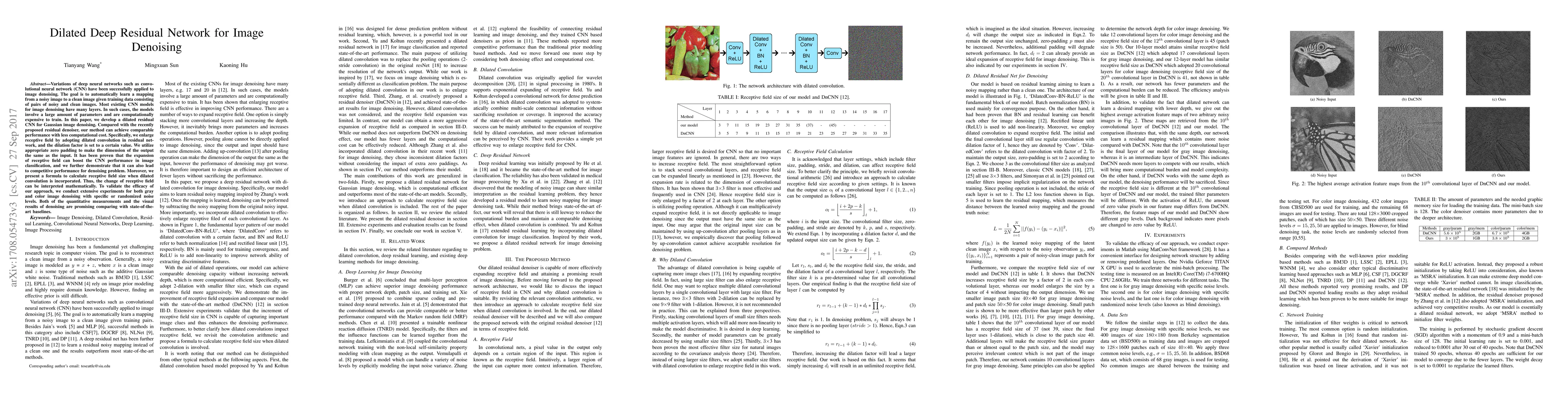 This paper proposes a dilated deep residual CNN for image denoising, utilizing dilated convolutions to enlarge the receptive field and reduce computational cost while achieving comparable denoising performance. The method demonstrates competitive results in both quantitative and visual evaluations against state-of-the-art baselines.