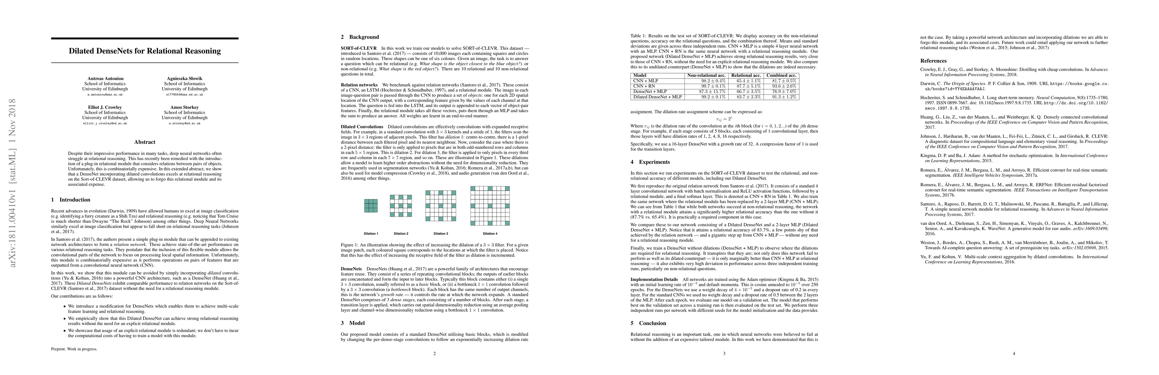 This paper proposes a Dilated DenseNet that effectively performs relational reasoning on the Sort-of-CLEVR dataset without the need for a combinatorially expensive relational module. The use of dilated convolutions enhances the network's ability to reason about relationships between objects.