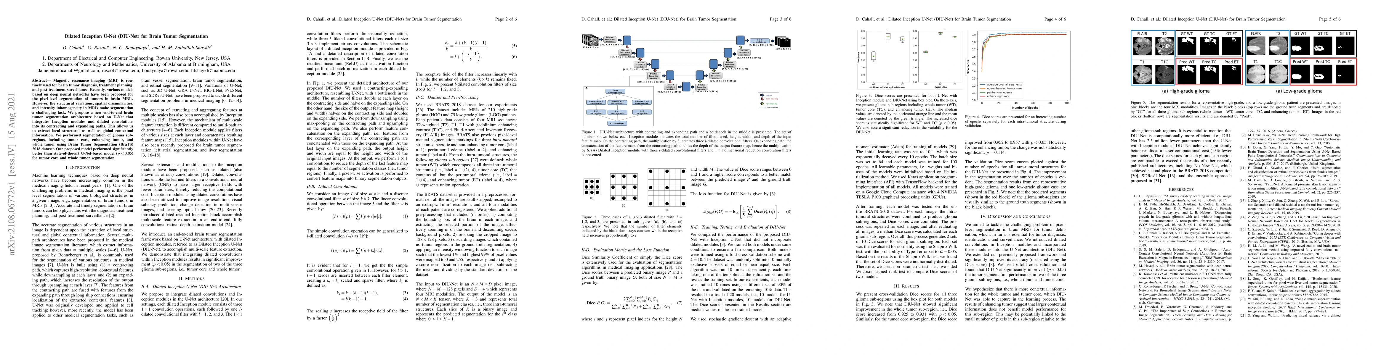 The paper proposes a Dilated Inception U-Net (DIU-Net) for brain tumor segmentation in MRIs, integrating Inception modules and dilated convolutions to extract both local and global contextual information. The DIU-Net outperformed the state-of-the-art U-Net-based model on the BraTS 2018 dataset for tumor core and whole tumor segmentation.