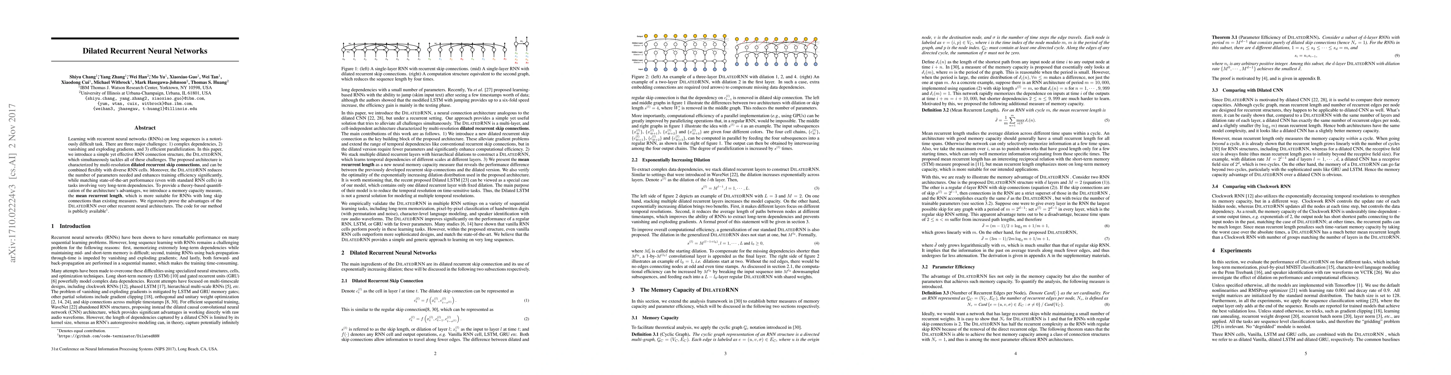 Learning with recurrent neural networks (RNNs) on long sequences is a notoriously difficult task. There are three major challenges: 1) complex dependencies, 2) vanishing and exploding gradients, and 3) efficient parallelization. In this paper, we introduce a simple yet effective RNN connection structure, the DilatedRNN, which simultaneously tackles all of these challenges. The proposed architecture is characterized by multi-resolution dilated recurrent skip connections and can be combined flexibly with diverse RNN cells. Moreover, the DilatedRNN reduces the number of parameters needed and enhances training efficiency significantly, while matching state-of-the-art performance (even with standard RNN cells) in tasks involving very long-term dependencies. To provide a theory-based quantification of the architecture's advantages, we introduce a memory capacity measure, the mean recurrent length, which is more suitable for RNNs with long skip connections than existing measures. We rigorously prove the advantages of the DilatedRNN over other recurrent neural architectures. The code for our method is publicly available at https://github.com/code-terminator/DilatedRNN