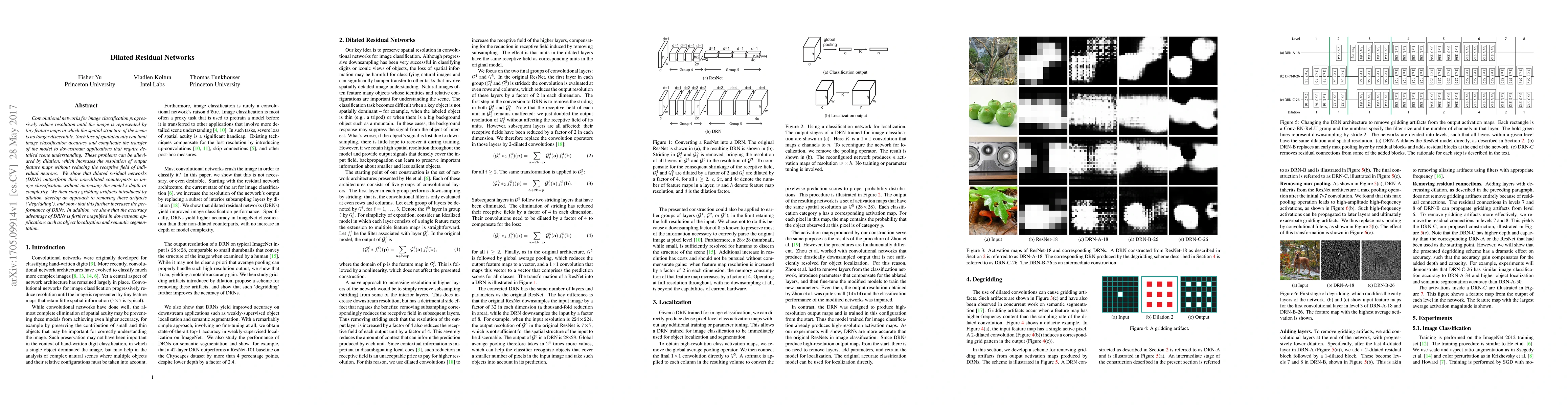 Convolutional networks for image classification progressively reduce resolution until the image is represented by tiny feature maps in which the spatial structure of the scene is no longer discernible. Such loss of spatial acuity can limit image classification accuracy and complicate the transfer of the model to downstream applications that require detailed scene understanding. These problems can be alleviated by dilation, which increases the resolution of output feature maps without reducing the receptive field of individual neurons. We show that dilated residual networks (DRNs) outperform their non-dilated counterparts in image classification without increasing the model's depth or complexity. We then study gridding artifacts introduced by dilation, develop an approach to removing these artifacts (`degridding'), and show that this further increases the performance of DRNs. In addition, we show that the accuracy advantage of DRNs is further magnified in downstream applications such as object localization and semantic segmentation.