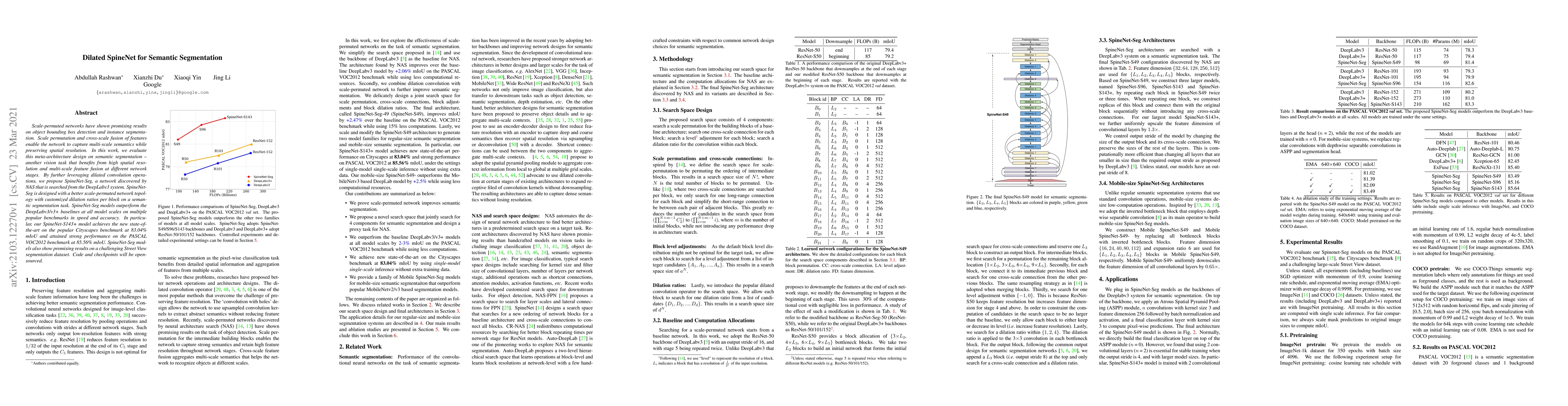 This paper proposes SpineNet-Seg, a scale-permuted network with dilated convolutions for semantic segmentation, discovered via NAS from the DeepLabv3 system. The model achieves state-of-the-art results on Cityscapes and PASCAL VOC2012 benchmarks, demonstrating superior speed and accuracy compared to baselines.