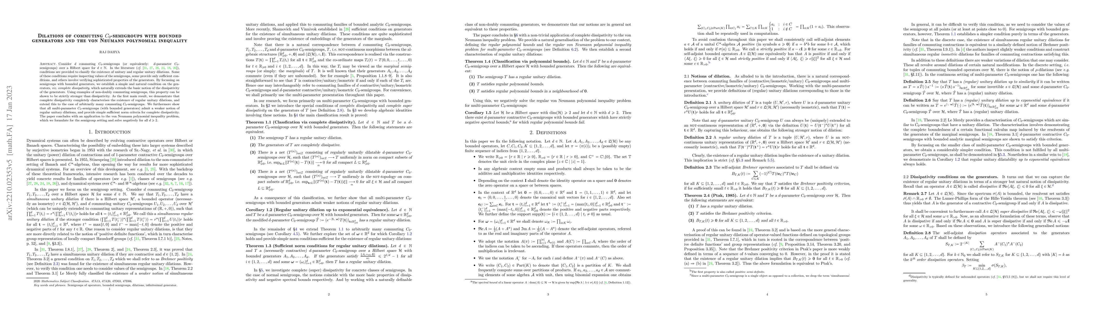 This paper investigates conditions for the existence of dilations of commuting $C_{0}$-semigroups with bounded generators, establishing that complete dissipativity characterizes the existence of regular unitary dilations. It concludes by solving the von Neumann polynomial inequality problem negatively for $d \geq 2$.