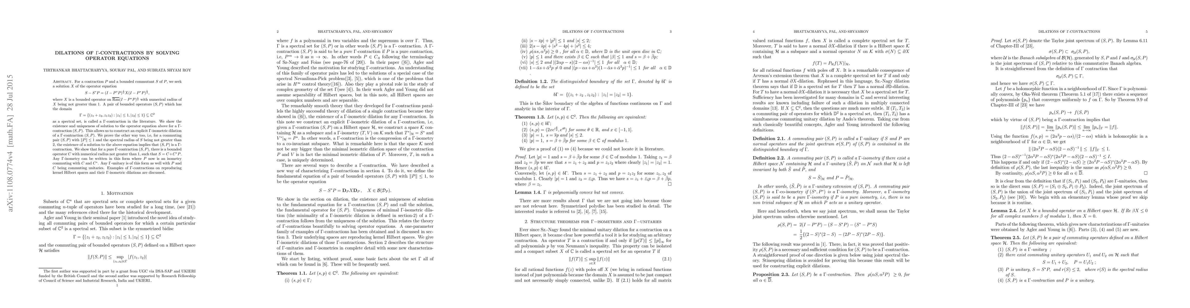 For a contraction P and a bounded commutant S of P, we seek a solution X of the operator equation S-S*P = (I-P*P)^1/2 X(I-P*P) 1/2, where X is a bounded operator on Ran(I-P*P) 1/2 with numerical radius of X being not greater than 1. A pair of bounded operators (S,P) which has the domain \Gamme = {(z 1 +z 2, z 1z 2) : |z1|{\leq} 1, |z2| {\leq}1} {\subseteq} C2 as a spectral set, is called a \Gamme-contraction in the literature. We show the existence and uniqueness of solution to the operator equation above for a \Gamma-contraction (S,P). This allows us to construct an explicit \Gamma-isometric dilation of a \Gamma-contraction (S,P). We prove the other way too, i.e, for a commuting pair (S,P) with |P|| {\leq} 1 and the spectral radius of S being not greater than 2, the existence of a solution to the above equation implies that (S,P) is a \Gamma-contraction. We show that for a pure \Gamma-contraction (S,P), there is a bounded operator C with numerical radius not greater than 1, such that S = C +C*P. Any \Gamma-isometry can be written in this form where P now is an isometry commuting with C and C*. Any \Gamma-unitary is of this form as well with P and C being commuting unitaries. Examples of \Gamma-contractions on reproducing kernel Hilbert spaces and their \Gamma-isometric dilations are discussed.