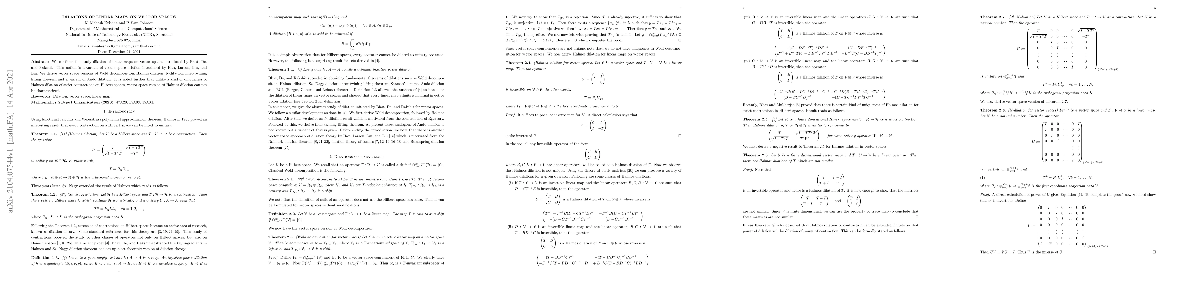 This paper extends the concept of dilation in linear maps on vector spaces, deriving new versions of several mathematical concepts, including Wold decomposition and Ando dilation, but noting that the vector space version of Halmos dilation cannot be uniquely characterized.
