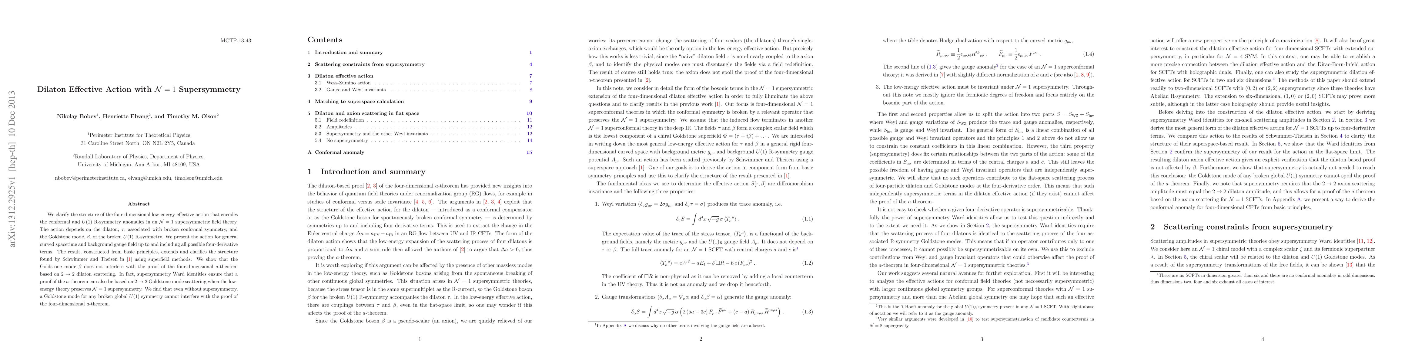 We clarify the structure of the four-dimensional low-energy effective action that encodes the conformal and $U(1)$ R-symmetry anomalies in an $\mathcal{N}=1$ supersymmetric field theory. The action depends on the dilaton, $\tau$, associated with broken conformal symmetry, and the Goldstone mode, $\beta$, of the broken $U(1)$ R-symmetry. We present the action for general curved spacetime and background gauge field up to and including all possible four-derivative terms. The result, constructed from basic principles, extends and clarifies the structure found by Schwimmer and Theisen in arXiv:1011.0696 using superfield methods. We show that the Goldstone mode $\beta$ does not interfere with the proof of the four-dimensional $a$-theorem based on $2 \to 2$ dilaton scattering. In fact, supersymmetry Ward identities ensure that a proof of the $a$-theorem can also be based on $2 \to 2$ Goldstone mode scattering when the low-energy theory preserves $\mathcal{N}=1$ supersymmetry. We find that even without supersymmetry, a Goldstone mode for any broken global $U(1)$ symmetry cannot interfere with the proof of the four-dimensional $a$-theorem.
