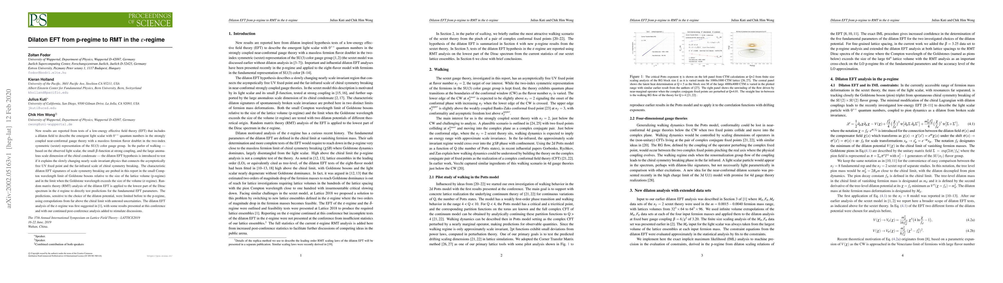 New results are reported from tests of a low-energy effective field theory (EFT) that includes a dilaton field to describe the emergent light scalar with ${ 0^{++} }$ quantum numbers in the strongly coupled near-conformal gauge theory with a massless fermion flavor doublet in the two-index symmetric (sextet) representation of the SU(3) color gauge group. In the parlor of walking --- based on the observed light scalar, the small $\beta$-function at strong coupling, and the large anomalous scale dimension of the chiral condensate --- the dilaton EFT hypothesis is introduced to test if it explains the slowly changing nearly scale invariant physics that connects the asymptotically free UV fixed point and the far-infrared scale of chiral symmetry breaking. The characteristic dilaton EFT signatures of scale symmetry breaking are probed in this report in the small Compton wavelength limit of Goldstone bosons relative to the size of the lattice volume (p-regime) and in the limit when the Goldstone wavelength exceeds the size of the volume ($\epsilon$-regime). Random matrix theory (RMT) analysis of the dilaton EFT is applied to the lowest part of the Dirac spectrum in the $\epsilon$-regime to directly test predictions for the fundamental EFT parameters. The predictions, sensitive to the choice of the dilaton potential, were limited before to the p-regime, using extrapolations from far above the chiral limit with untested uncertainties. The dilaton EFT analysis of the $\epsilon$-regime was first suggested in \cite{Fodor:2019vmw}, with some results presented at this conference and with our continued post-conference analysis added to stimulate discussions.