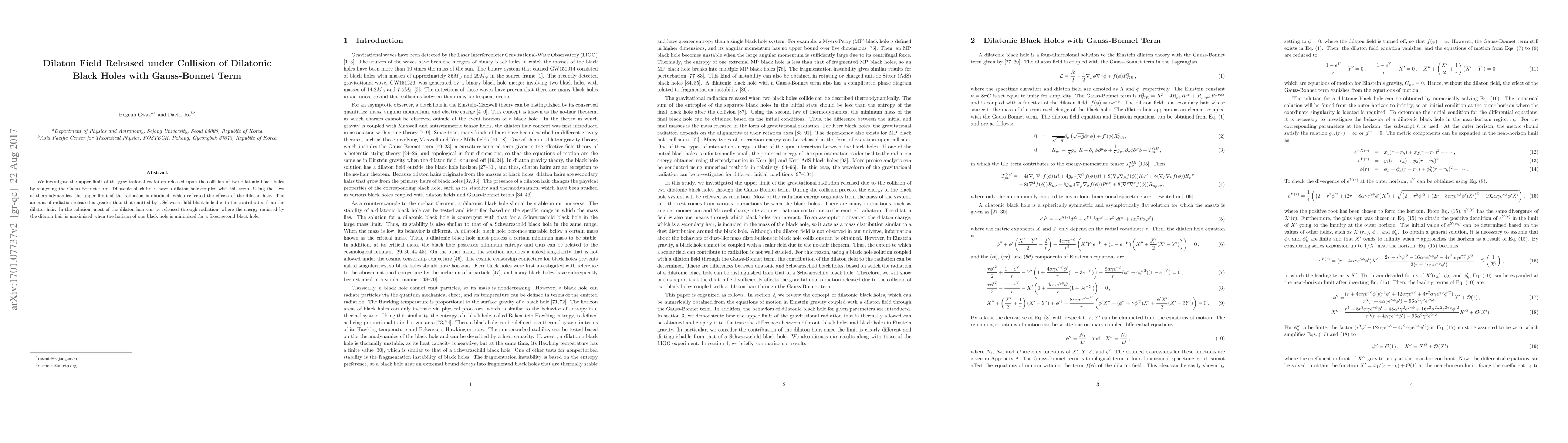 We investigate the upper limit of the gravitational radiation released upon the collision of two dilatonic black holes by analyzing the Gauss-Bonnet term. Dilatonic black holes have a dilaton hair coupled with this term. Using the laws of thermodynamics, the upper limit of the radiation is obtained, which reflected the effects of the dilaton hair. The amount of radiation released is greater than that emitted by a Schwarzschild black hole due to the contribution from the dilaton hair. In the collision, most of the dilaton hair can be released through radiation, where the energy radiated by the dilaton hair is maximized when the horizon of one black hole is minimized for a fixed second black hole.
