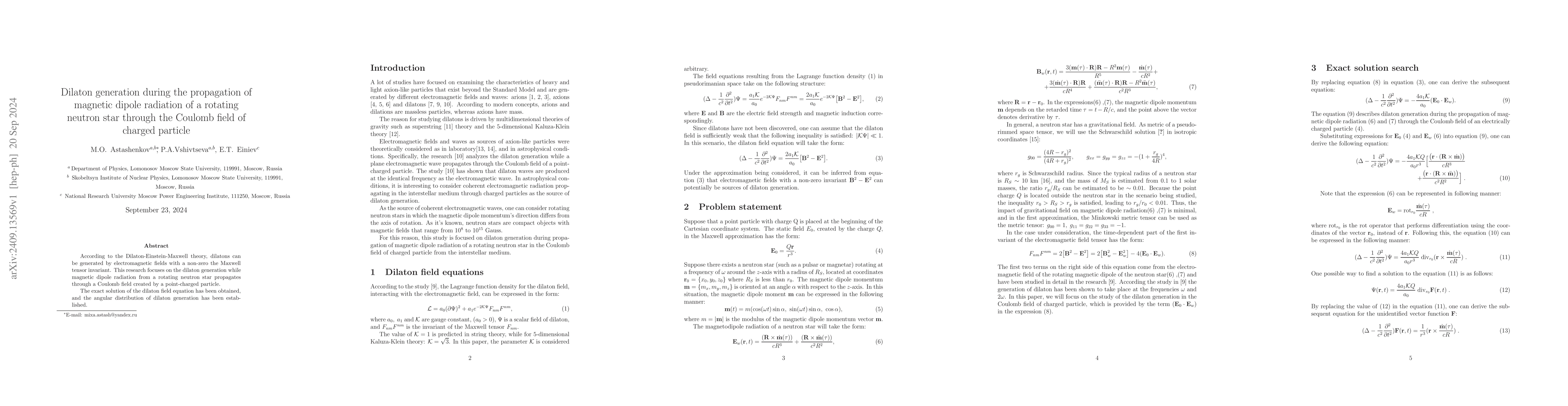 This study investigates dilaton generation during the propagation of magnetic dipole radiation from a rotating neutron star through the Coulomb field of a point-charged particle, deriving an exact solution for the dilaton field equation and establishing its angular distribution.