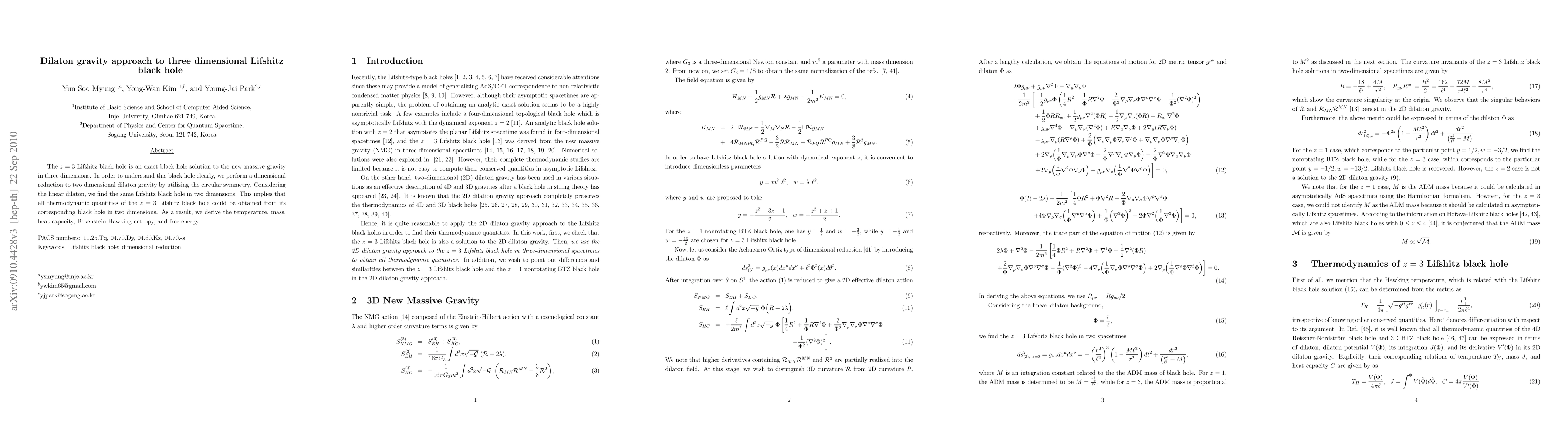 This paper explores a three-dimensional Lifshitz black hole through a dimensional reduction to two-dimensional dilaton gravity, finding a corresponding black hole solution that maintains thermodynamic properties, including temperature, mass, entropy, and free energy.