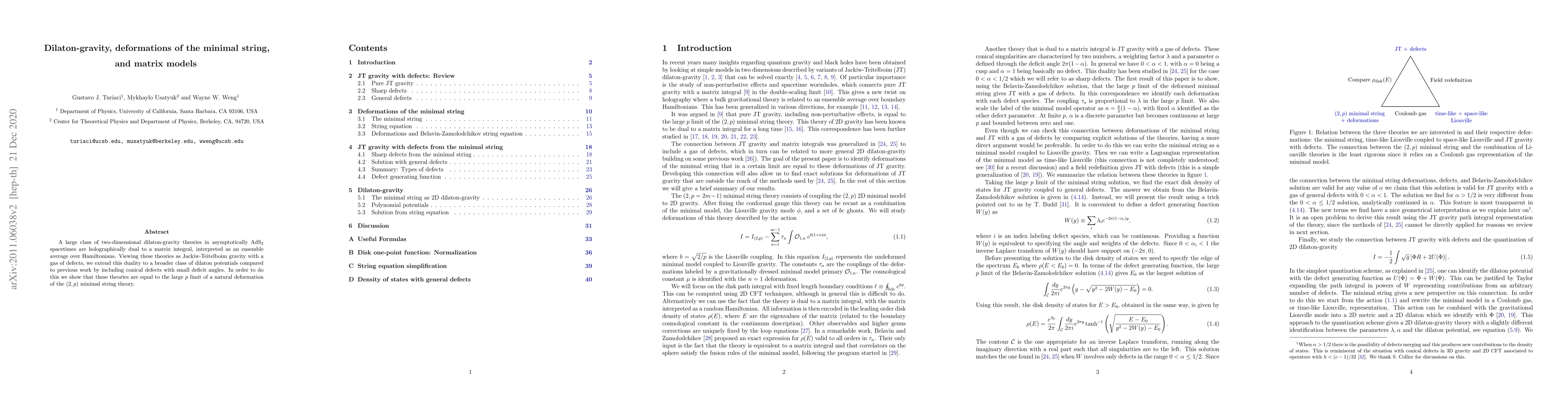 A large class of two-dimensional dilaton-gravity theories in asymptotically AdS$_2$ spacetimes are holographically dual to a matrix integral, interpreted as an ensemble average over Hamiltonians. Viewing these theories as Jackiw-Teitelboim gravity with a gas of defects, we extend this duality to a broader class of dilaton potentials compared to previous work by including conical defects with small deficit angles. In order to do this we show that these theories are equal to the large $p$ limit of a natural deformation of the $(2,p)$ minimal string theory.