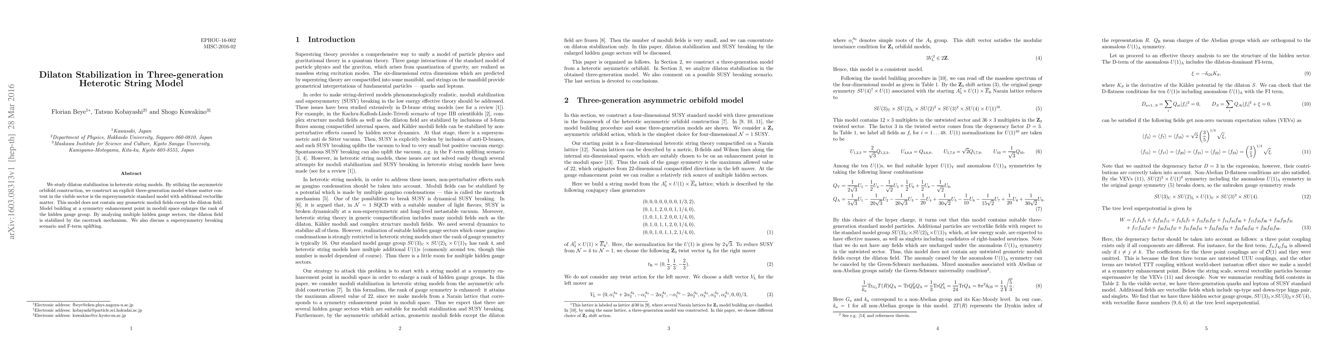This paper explores dilaton stabilization in a three-generation heterotic string model using asymmetric orbifold construction, achieving a supersymmetric standard model with vectorlike matter. The dilaton is stabilized via the racetrack mechanism through hidden gauge sectors, and the study includes a discussion on supersymmetry breaking and F-term uplifting.