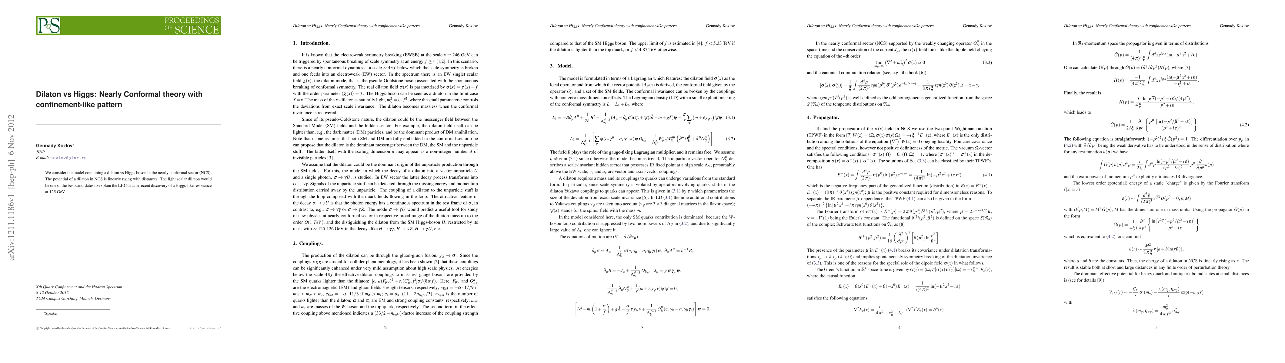 We consider the model containing a dilaton vs Higgs boson in the nearly conformal sector (NCS). The potential of a dilaton in NCS is linearly rising with distances. The light scalar dilaton would be one of the best candidates to explain the LHC data in recent discovery of a Higgs-like resonance at 125 GeV.