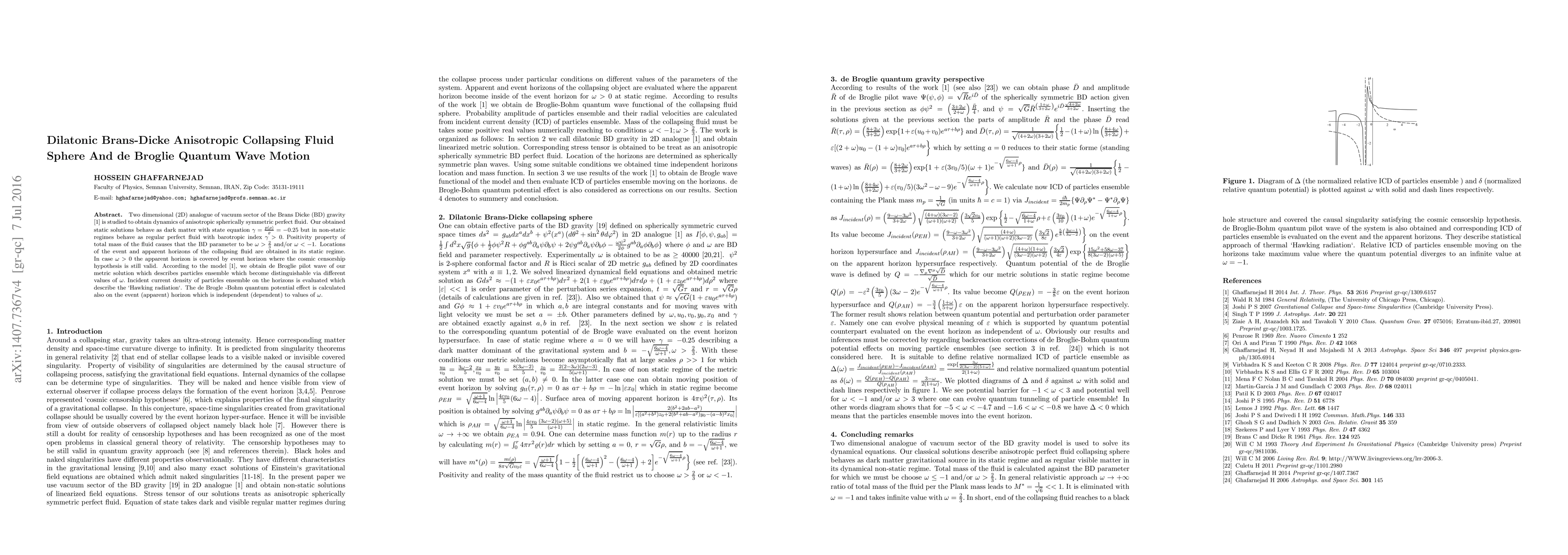 Two dimensional (2D) analogue of vacuum sector of the Brans Dicke (BD) gravity [1] is studied to obtain dynamics of anisotropic spherically symmetric perfect fluid. Our obtained static solutions behave as dark matter with state equation $\gamma=\frac{p(\rho)}{\varrho}=-0.25$ but in non-static regimes behave as regular perfect fluid with barotropic index $\gamma>0.$ Positivity property of total mass of the fluid causes that the BD parameter to be $\omega>\frac{2}{3}$ and/or $\omega<-1$. Locations of the event and apparent horizons of the collapsing fluid are obtained in its static regime. In case $\omega>0$ the apparent horizon is covered by event horizon where the cosmic censorship hypothesis is still valid. According to the model [1], we obtain de Broglie pilot wave of our metric solution which describes particles ensemble which become distinguishable via different values of $\omega.$ Incident current density of particles ensemble on the horizons is evaluated which describe the `Hawking radiation`. The de Brogle -Bohm quantum potential effect is calculated also on the event (apparent) horizon which is independent (dependent) to values of $\omega.$