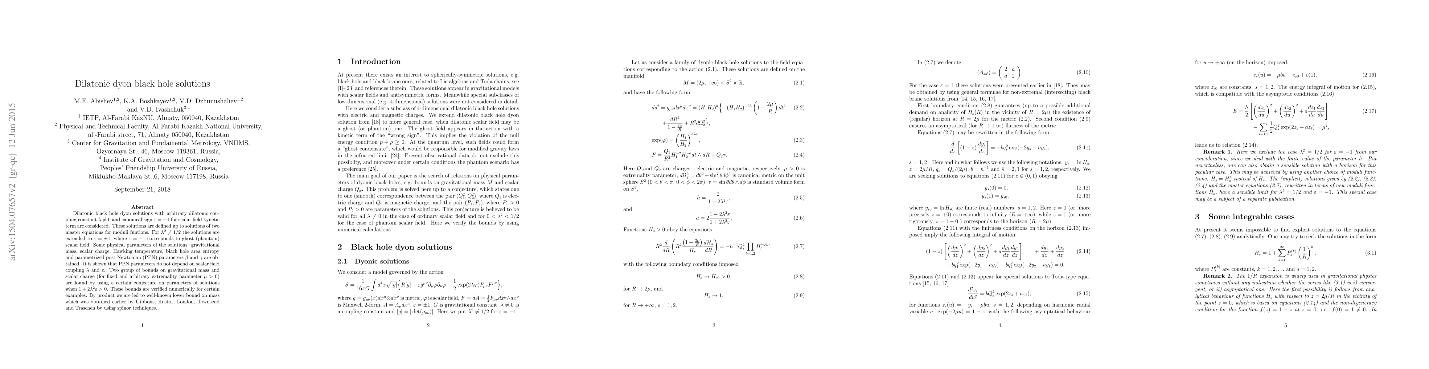This paper explores dilatonic black hole solutions with dyon characteristics and arbitrary dilatonic coupling constants, deriving solutions for both positive and negative scalar field signs. It establishes bounds on gravitational mass and scalar charge, confirming a well-known lower mass bound previously derived by other methods.