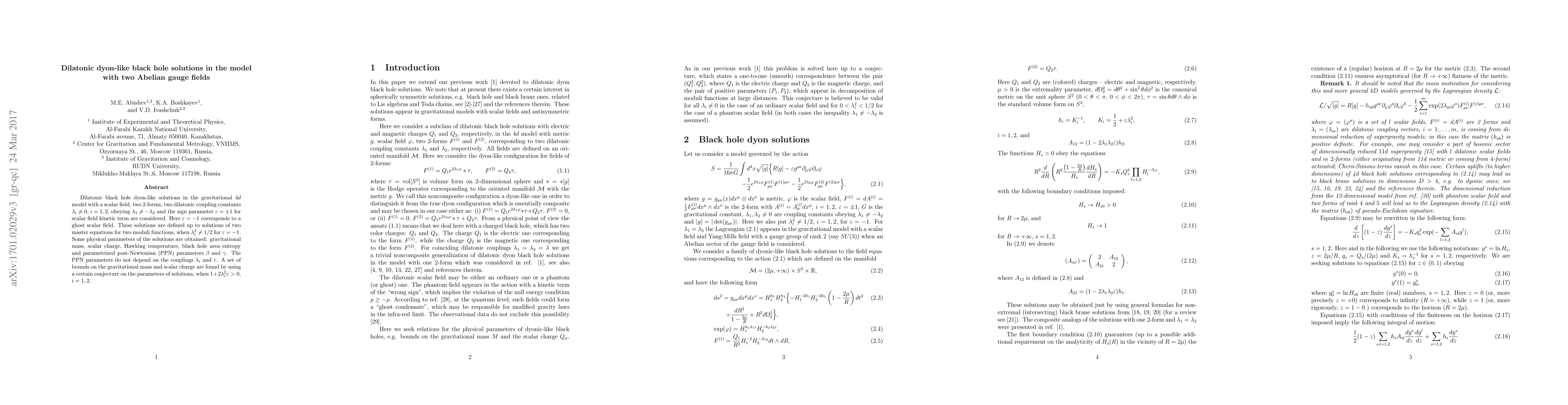 This paper explores dilatonic black hole dyon-like solutions in a $4d$ gravitational model with two Abelian gauge fields and a scalar field, deriving physical parameters including mass, charge, temperature, and entropy, and finding bounds on mass and charge based on conjectured parameters. The parametrized post-Newtonian parameters remain independent of the coupling constants.