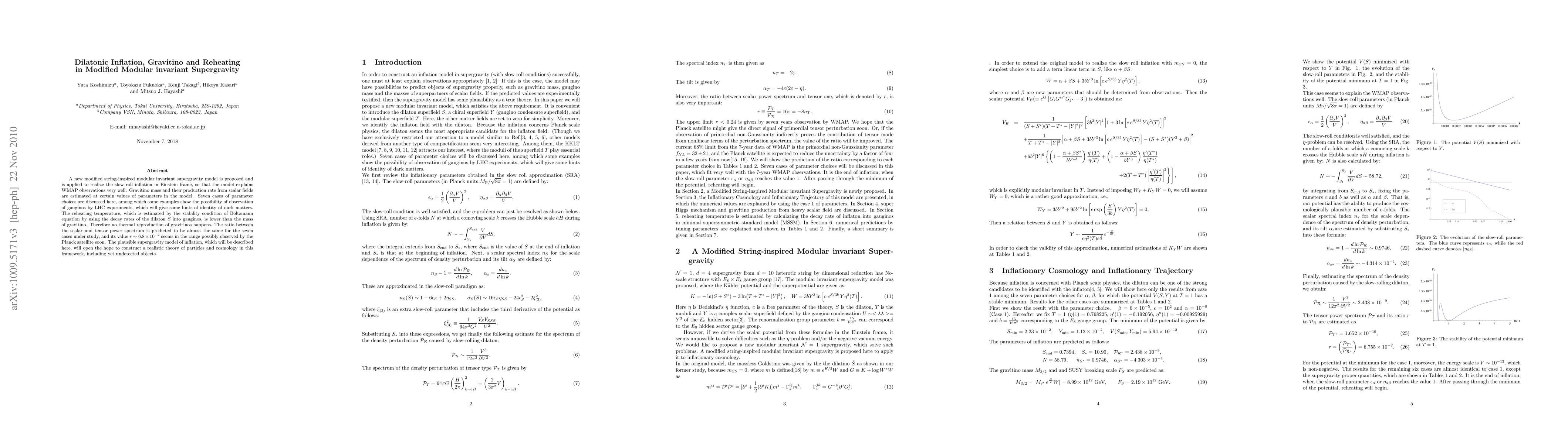 This paper proposes a modified modular invariant supergravity model for dilatonic inflation, explaining WMAP observations. It estimates gravitino mass and production, discusses potential LHC observations of gauginos, and predicts a low reheating temperature preventing gravitino thermal reproduction. The model predicts a scalar-to-tensor ratio of $r \sim 6.8 \times 10^{-2}$, possibly observable by the Planck satellite.