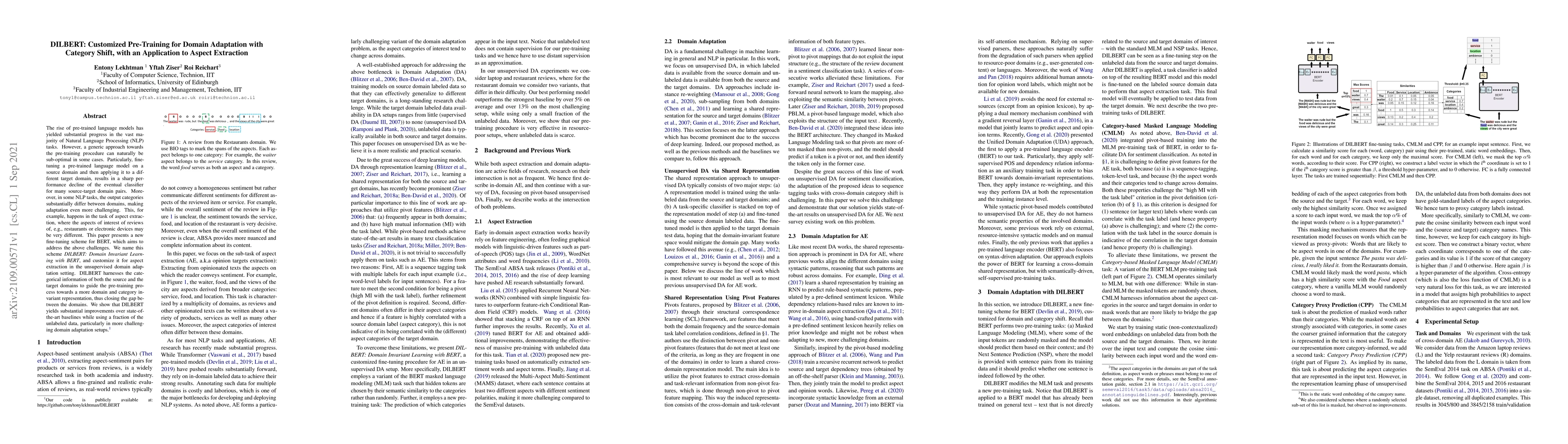 The rise of pre-trained language models has yielded substantial progress in the vast majority of Natural Language Processing (NLP) tasks. However, a generic approach towards the pre-training procedure can naturally be sub-optimal in some cases. Particularly, fine-tuning a pre-trained language model on a source domain and then applying it to a different target domain, results in a sharp performance decline of the eventual classifier for many source-target domain pairs. Moreover, in some NLP tasks, the output categories substantially differ between domains, making adaptation even more challenging. This, for example, happens in the task of aspect extraction, where the aspects of interest of reviews of, e.g., restaurants or electronic devices may be very different. This paper presents a new fine-tuning scheme for BERT, which aims to address the above challenges. We name this scheme DILBERT: Domain Invariant Learning with BERT, and customize it for aspect extraction in the unsupervised domain adaptation setting. DILBERT harnesses the categorical information of both the source and the target domains to guide the pre-training process towards a more domain and category invariant representation, thus closing the gap between the domains. We show that DILBERT yields substantial improvements over state-of-the-art baselines while using a fraction of the unlabeled data, particularly in more challenging domain adaptation setups.