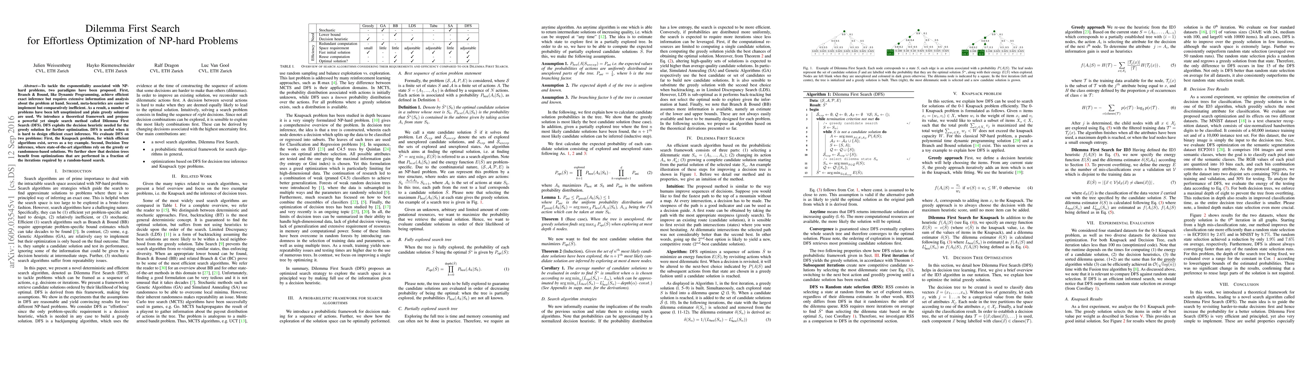 To tackle the exponentiality associated with NP-hard problems, two paradigms have been proposed. First, Branch & Bound, like Dynamic Programming, achieve efficient exact inference but requires extensive information and analysis about the problem at hand. Second, meta-heuristics are easier to implement but comparatively inefficient. As a result, a number of problems have been left unoptimized and plain greedy solutions are used. We introduce a theoretical framework and propose a powerful yet simple search method called Dilemma First Search (DFS). DFS exploits the decision heuristic needed for the greedy solution for further optimization. DFS is useful when it is hard to design efficient exact inference. We evaluate DFS on two problems: First, the Knapsack problem, for which efficient algorithms exist, serves as a toy example. Second, Decision Tree inference, where state-of-the-art algorithms rely on the greedy or randomness-based solutions. We further show that decision trees benefit from optimizations that are performed in a fraction of the iterations required by a random-based search.
