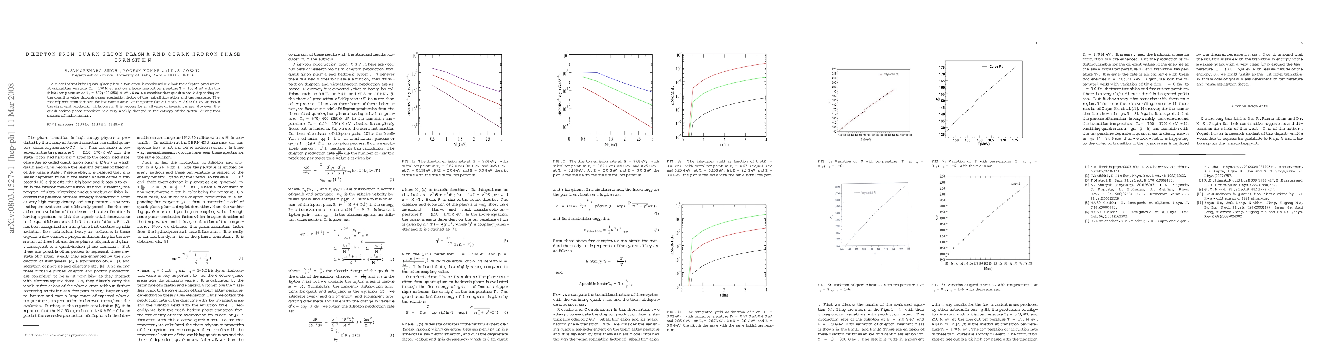 A model of statistical quark-gluon plasma formation is considered.We look the dilepton production at critical temperature $T_{c}\sim170 Mev $ and completely free out temperature $T=150 MeV$ with the initial temperature as $T_{0}=570,400 (250) MeV$. Now we consider that quark mass is depending on the coupling value through parameterisation factor of the fireball formation and temperature. The rate of production is shown for invariant mass $M$ at the particular value of $ E=2.0,3.0 GeV$.It shows the significant production of leptons in this process for small value of invariant mass. However, the quark-hadron phase transition is a very weakly changed in the entropy of the system during this process of hadronisation.