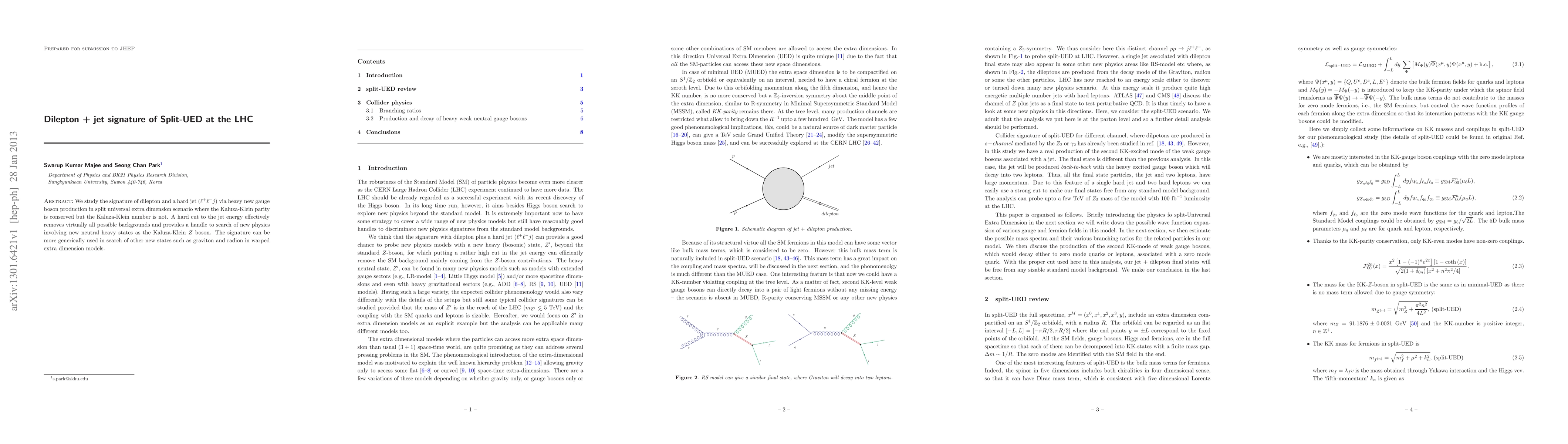 We study the signature of dilepton and a hard jet ($\ell^+\ell^-j$) via heavy new gauge boson production in split universal extra dimension scenario where the Kaluza-Klein parity is conserved but the Kaluza-Klein number is not. A hard cut to the jet energy effectively removes virtually all possible backgrounds and provides a handle to search of new physics involving new neutral heavy states as the Kaluza-Klein $Z$ boson. The signature can be more generically used in search of other new states such as graviton and radion in warped extra dimension models.