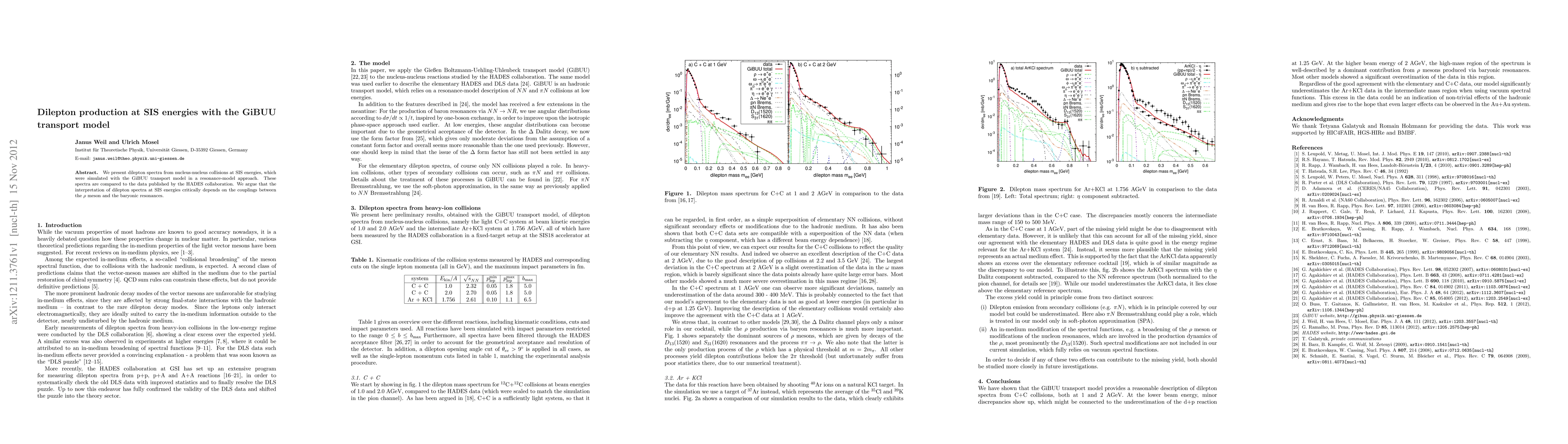 This paper uses the GiBUU transport model to simulate dilepton production in nucleus-nucleus collisions at SIS energies, comparing the results to HADES data. The study emphasizes that the interpretation of these spectra hinges on the interactions between the ρ meson and baryonic resonances.