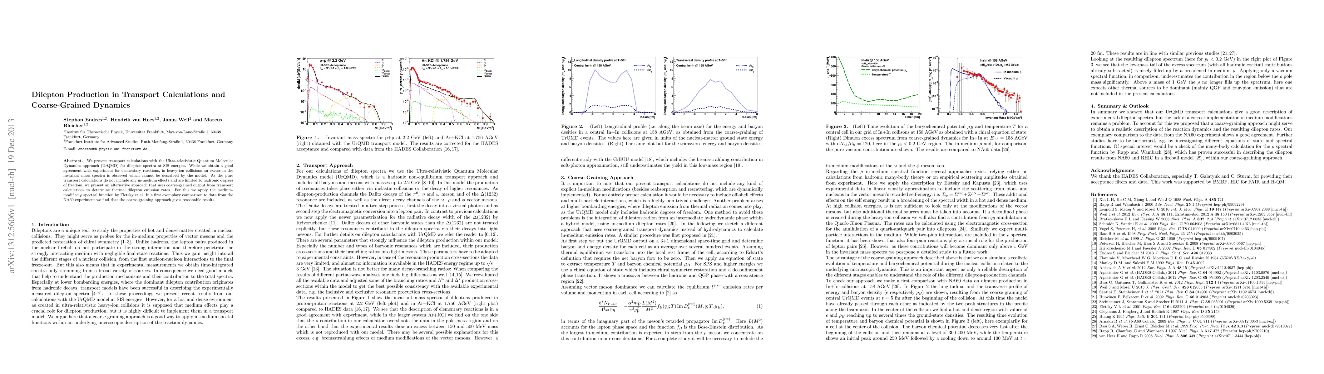 We present transport calculations with the Ultra-relativistic Quantum Molecular Dynamics approach (UrQMD) for dilepton spectra at SIS energies. While we obtain a good agreement with experiment for elementary reactions, in heavy-ion collisions an excess in the invariant mass spectra is observed which cannot be described by the model. As the pure transport calculations do not include any in-medium effects and are limited to hadronic degrees of freedom, we present an alternative approach that uses coarse-grained output from transport calculations to determine thermal dilepton emission rates. For this we apply the medium-modified $\rho$ spectral function by Eletsky et al. In a first exemplary comparison to data from the NA60 experiment we find that the coarse-graining approach gives reasonable results.