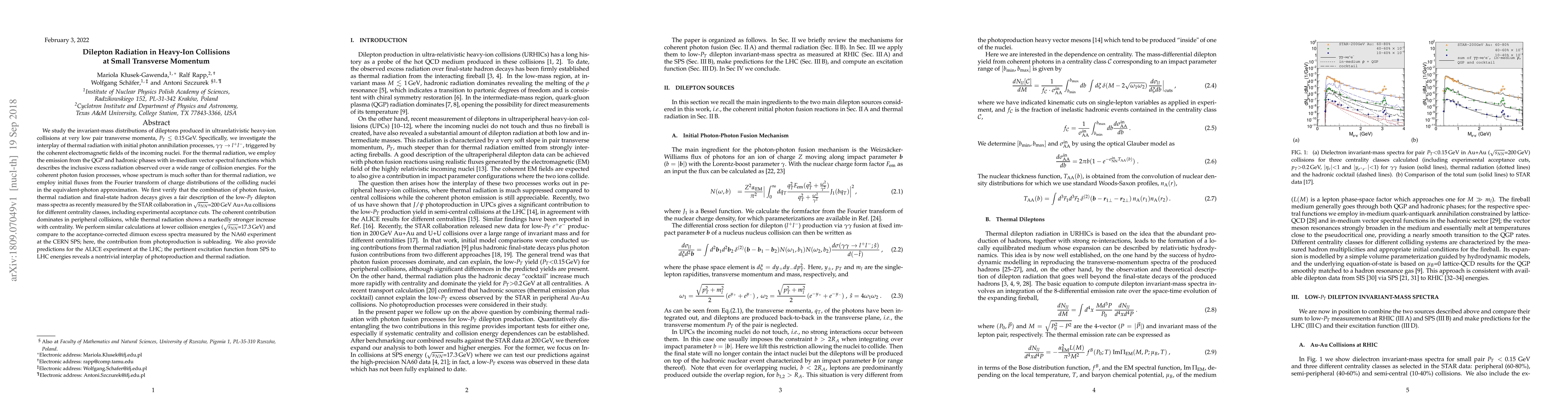 We study the invariant-mass distributions of dileptons produced in ultrarelativistic heavy-ion collisions at very low pair transverse momenta, $P_T\leq 0.15$ GeV. Specifically, we investigate the interplay of thermal radiation with initial photon annihilation processes, $\gamma \gamma \to l^+ l^-$, triggered by the coherent electromagnetic fields of the incoming nuclei. For the thermal radiation, we employ the emission from the QGP and hadronic phases with in-medium vector spectral functions which describes the inclusive excess radiation observed over a wide range of collision energies. For the coherent photon fusion processes, whose spectrum is much softer than for thermal radiation, we employ initial fluxes from the Fourier transform of charge distributions of the colliding nuclei in the equivalent-photon approximation. We first verify that the combination of photon fusion, thermal radiation and final-state hadron decays gives a fair description of the low-$P_T$ dilepton mass spectra as recently measured by the STAR collaboration in $\sqrt{s_{NN}}$=200 GeV Au+Au collisions for different centrality classes, including experimental acceptance cuts. The coherent contribution dominates in peripheral collisions, while thermal radiation shows a markedly stronger increase with centrality. We perform similar calculations at lower collision energies ($\sqrt{s_{NN}}$=17.3 GeV) and compare to the acceptance-corrected dimuon excess spectra measured by the NA60 experiment at the CERN SPS; here, the contribution from photoproduction is subleading. We also provide predictions for the ALICE experiment at the LHC; the pertinent excitation function from SPS to LHC energies reveals a nontrivial interplay of photoproduction and thermal radiation.