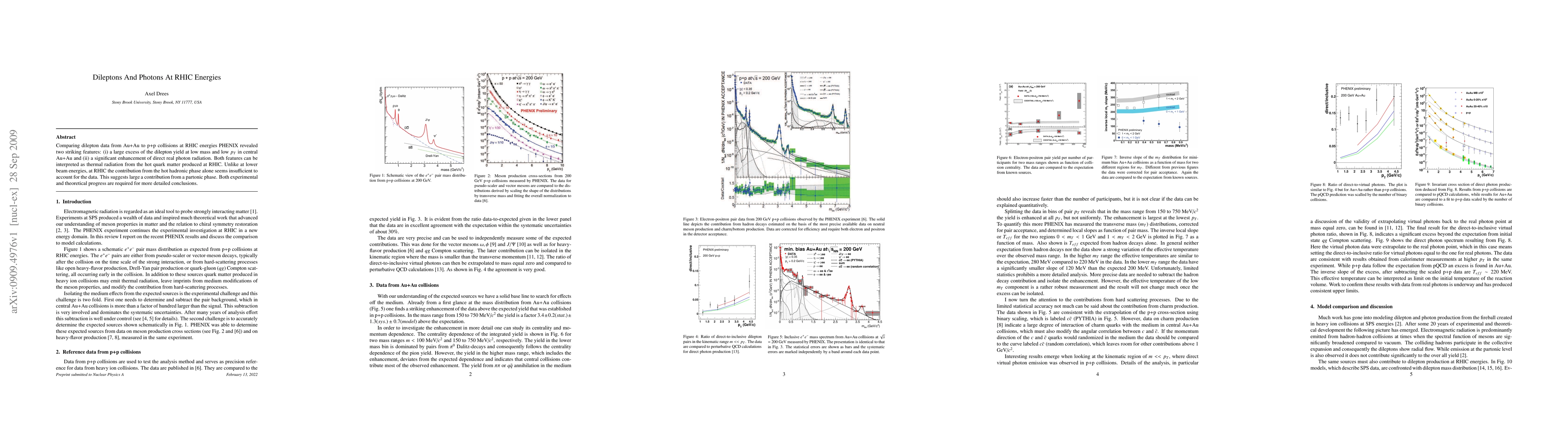 The PHENIX study at RHIC reveals a significant excess of low-mass dileptons and enhanced direct photon radiation in Au+Au collisions compared to p+p collisions, indicating thermal radiation from hot quark matter. The data suggest a substantial contribution from a partonic phase beyond the hot hadronic phase.