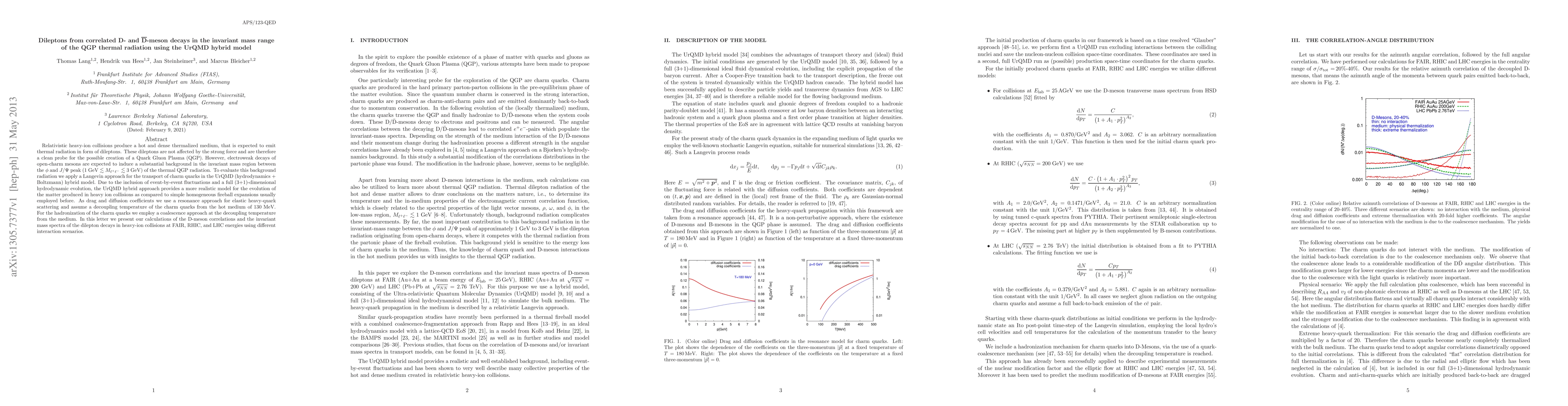 Relativistic heavy-ion collisions produce a hot and dense thermalized medium, that is expected to emit thermal radiation in form of dileptons. These dileptons are not affected by the strong force and are therefore a clean probe for the possible creation of a Quark Gluon Plasma (QGP). However, electroweak decays of open-charm mesons are expected to induce a substantial background in the invariant mass region between the $\phi$ and $J/\Psi$ peak ($1\,\text{GeV} \lesssim M_{\ell^+ \ell^-} \lesssim 3 \,\text{GeV}$) of the thermal QGP radiation. To evaluate this background radiation we apply a Langevin approach for the transport of charm quarks in the UrQMD (hydrodynamics + Boltzmann) hybrid model. Due to the inclusion of event-by-event fluctuations and a full (3+1)-dimensional hydrodynamic evolution, the UrQMD hybrid approach provides a more realistic model for the evolution of the matter produced in heavy ion collisions as compared to simple homogeneous fireball expansions usually employed before. As drag and diffusion coefficients we use a resonance approach for elastic heavy-quark scattering and assume a decoupling temperature of the charm quarks from the hot medium of $130\,\text{MeV}$. For the hadronization of the charm quarks we employ a coalescence approach at the decoupling temperature from the medium. In this letter we present our calculations of the D-meson correlations and the invariant mass spectra of the dilepton decays in heavy-ion collisions at FAIR, RHIC, and LHC energies using different interaction scenarios.