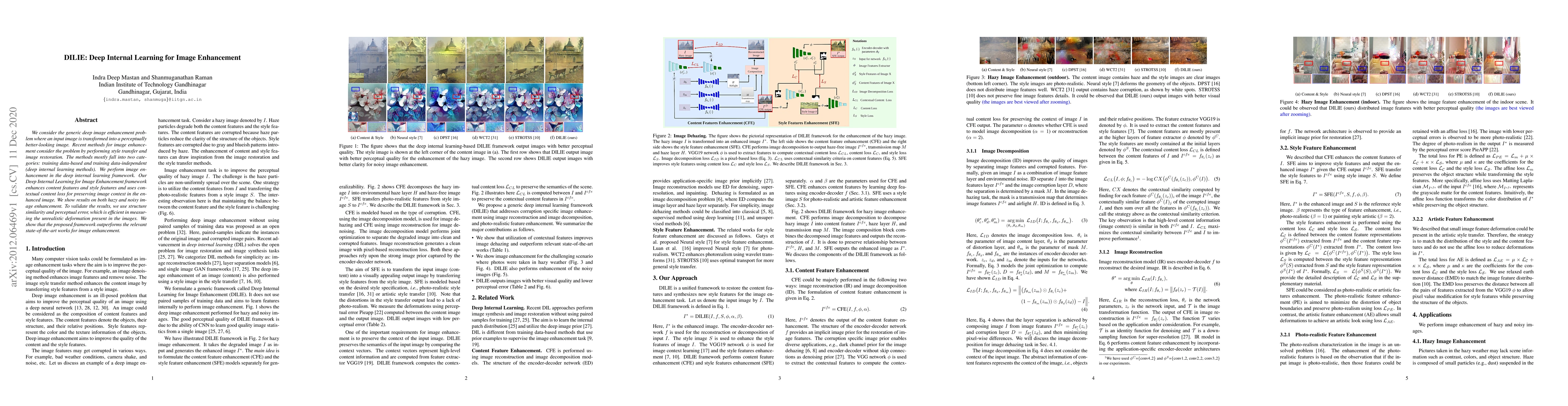 The DILIE framework enhances images by leveraging deep internal learning to improve both content and style features while maintaining context, outperforming other methods in enhancing hazy and noisy images based on structure similarity and perceptual error metrics.