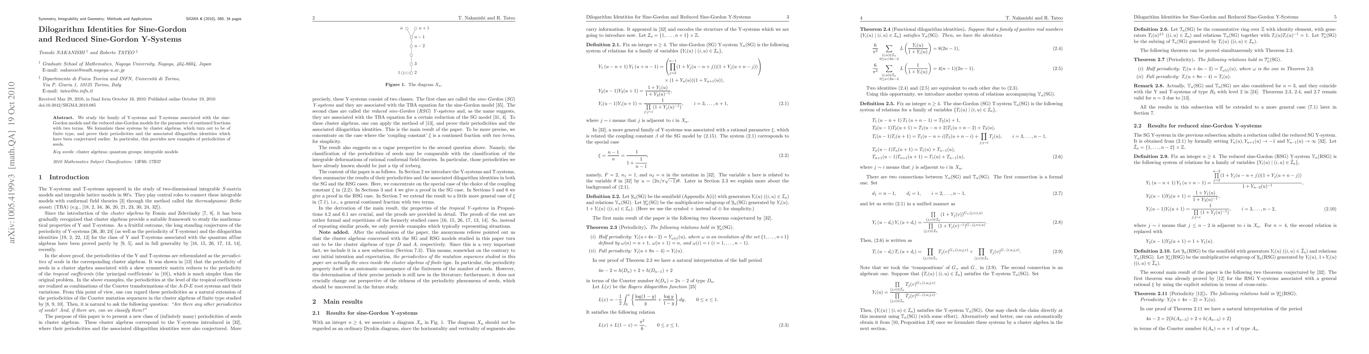 This paper explores the Y-systems and T-systems linked to sine-Gordon models and reduced sine-Gordon models, proving their periodicities and establishing new dilogarithm identities, previously conjectured, using cluster algebras of finite type. These findings offer novel examples of periodicities in seed structures.