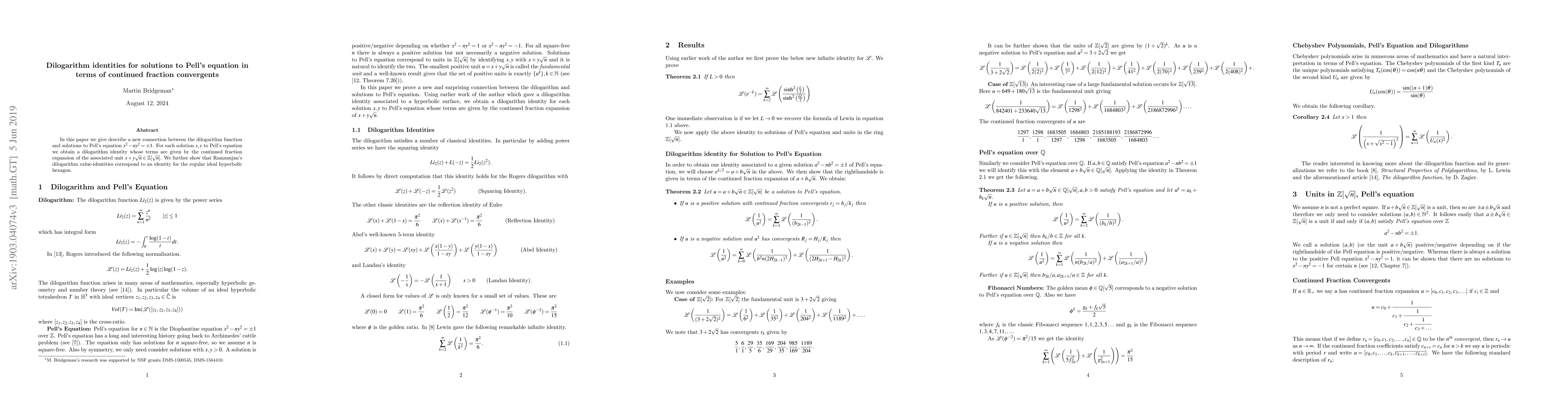 This paper establishes a novel link between the dilogarithm function and solutions to Pell's equation, expressing dilogarithm identities in terms of continued fraction convergents. It also reveals that Ramanujan's dilogarithm value-identities relate to an identity for the regular ideal hyperbolic hexagon.