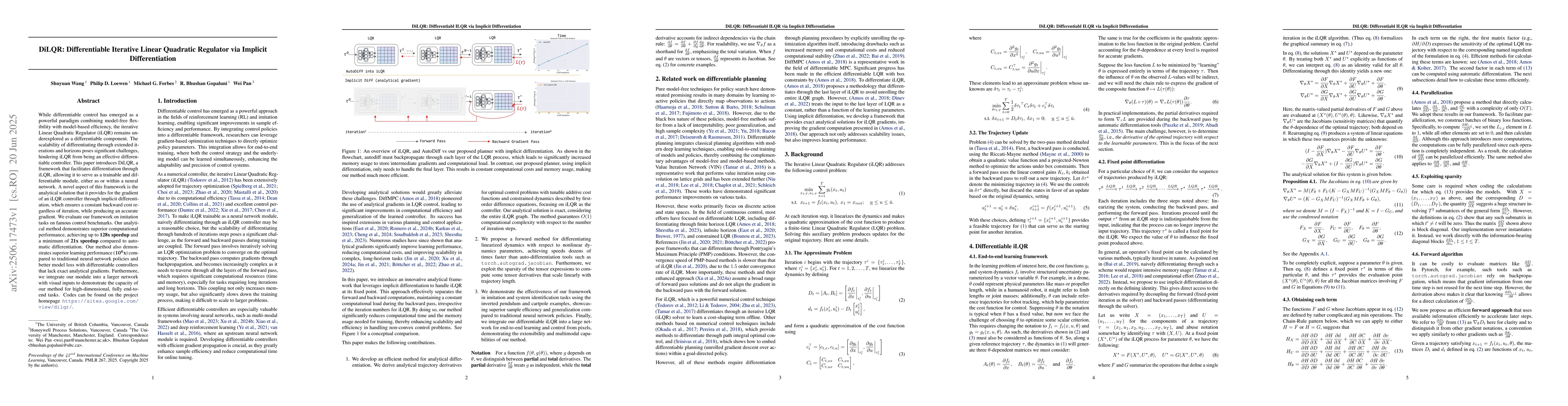 While differentiable control has emerged as a powerful paradigm combining model-free flexibility with model-based efficiency, the iterative Linear Quadratic Regulator (iLQR) remains underexplored as a differentiable component. The scalability of differentiating through extended iterations and horizons poses significant challenges, hindering iLQR from being an effective differentiable controller. This paper introduces DiLQR, a framework that facilitates differentiation through iLQR, allowing it to serve as a trainable and differentiable module, either as or within a neural network. A novel aspect of this framework is the analytical solution that it provides for the gradient of an iLQR controller through implicit differentiation, which ensures a constant backward cost regardless of iteration, while producing an accurate gradient. We evaluate our framework on imitation tasks on famous control benchmarks. Our analytical method demonstrates superior computational performance, achieving up to 128x speedup and a minimum of 21x speedup compared to automatic differentiation. Our method also demonstrates superior learning performance ($10^6$x) compared to traditional neural network policies and better model loss with differentiable controllers that lack exact analytical gradients. Furthermore, we integrate our module into a larger network with visual inputs to demonstrate the capacity of our method for high-dimensional, fully end-to-end tasks. Codes can be found on the project homepage https://sites.google.com/view/dilqr/.