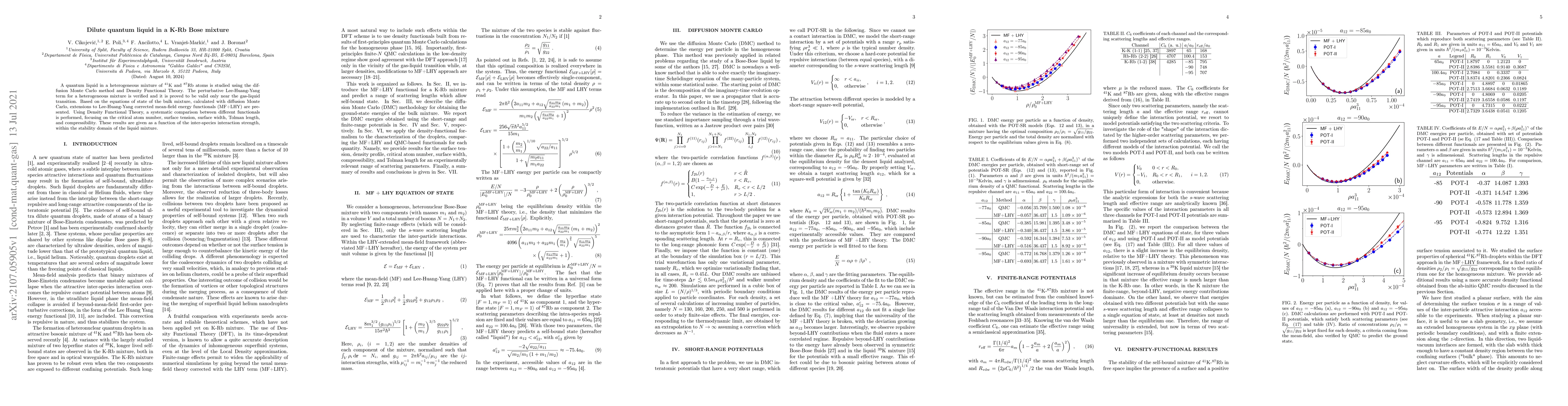 A quantum liquid in a heterogeneous mixture of $^{41}$K and $^{87}$Rb atoms is studied using the diffusion Monte Carlo method and Density Functional Theory. The perturbative Lee-Huang-Yang term for a heterogeneous mixture is verified and it is proved to be valid only near the gas-liquid transition. Based on the equations of state of the bulk mixture, calculated with diffusion Monte Carlo, extensions to Lee-Huang-Yang corrected mean-field energy functionals (MF+LHY) are presented. Using Density Functional Theory, a systematic comparison between different functionals is performed, focusing on the critical atom number, surface tension, surface width, Tolman length, and compressibility. These results are given as a function of the inter-species interaction strength, within the stability domain of the liquid mixture.