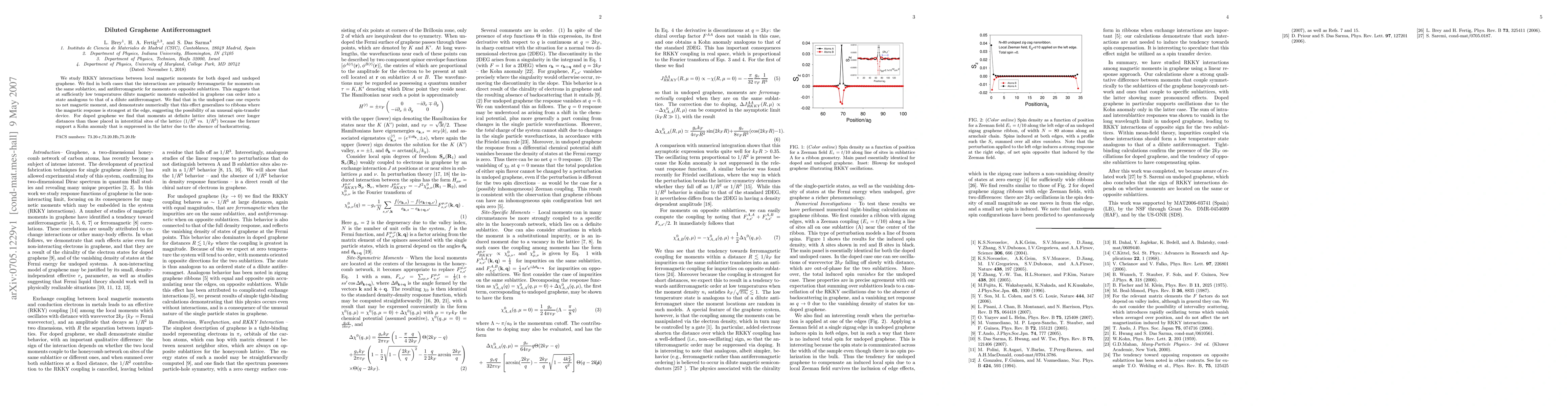 We study RKKY interactions between local magnetic moments for both doped and undoped graphene. We find in both cases that the interactions are primarily ferromagnetic for moments on the same sublattice, and antiferromagnetic for moments on opposite sublattices. This suggests that at sufficiently low temperatures dilute magnetic moments embedded in graphene can order into a state analogous to that of a dilute antiferromagnet. We find that in the undoped case one expects no net magnetic moment, and demonstrate numerically that this effect generalizes to ribbons where the magnetic response is strongest at the edge, suggesting the possibility of an unusual spin-transfer device. For doped graphene we find that moments at definite lattice sites interact over longer distances than those placed in interstitial sites of the lattice ($1/R^2$ vs. $1/R^3$) because the former support a Kohn anomaly that is suppressed in the latter due to the absence of backscattering.