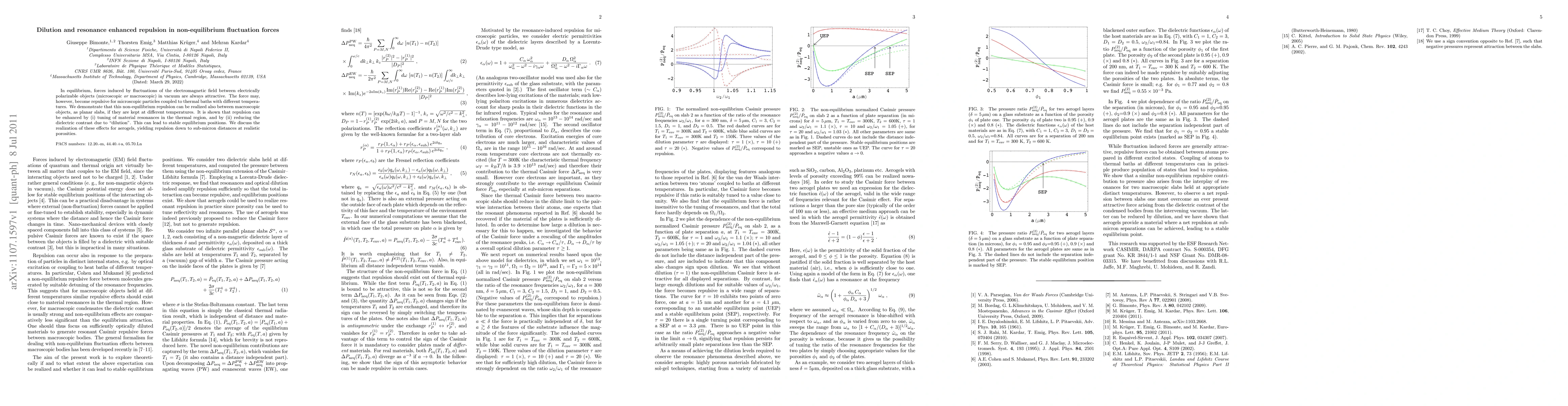 In equilibrium, forces induced by fluctuations of the electromagnetic field between electrically polarizable objects (microscopic or macroscopic) in vacuum are always attractive. The force may, however, become repulsive for microscopic particles coupled to thermal baths with different temperatures. We demonstrate that this non-equilibrium repulsion can be realized also between macroscopic objects, as planar slabs, if they are kept at different temperatures. It is shown that repulsion can be enhanced by (i) tuning of material resonances in the thermal region, and by (ii) reducing the dielectric contrast due to "dilution". This can lead to stable equilibrium positions. We discuss the realization of these effects for aerogels, yielding repulsion down to sub-micron distances at realistic porosities.