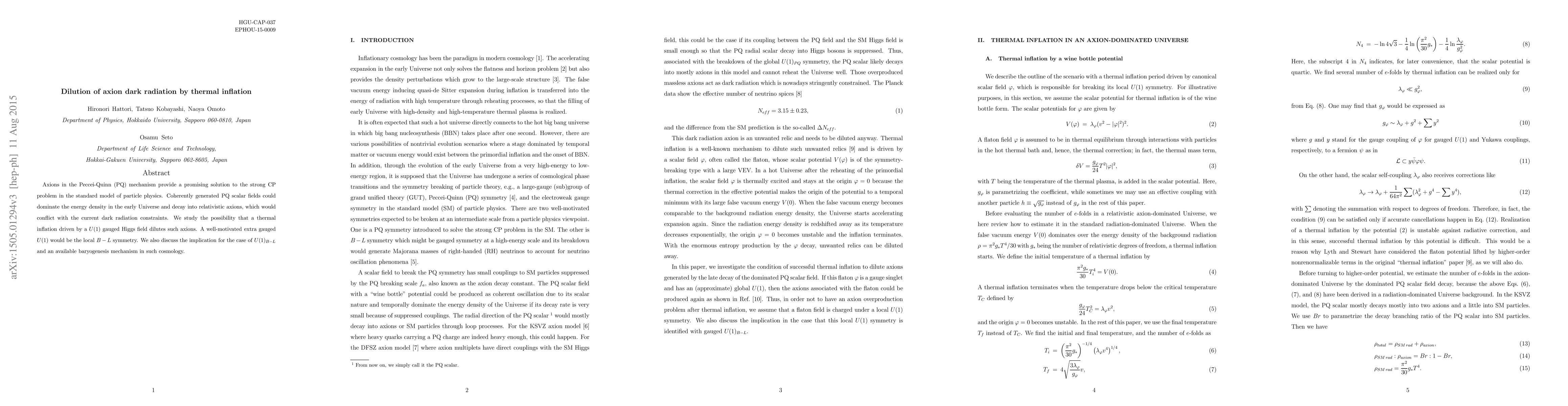 This paper explores how thermal inflation driven by a $U(1)$ gauged Higgs field, specifically the local $B-L$ symmetry, can dilute axion dark radiation generated from coherent PQ scalar fields, thereby resolving conflicts with current dark radiation constraints. It also discusses the implications for baryogenesis in this cosmological context.