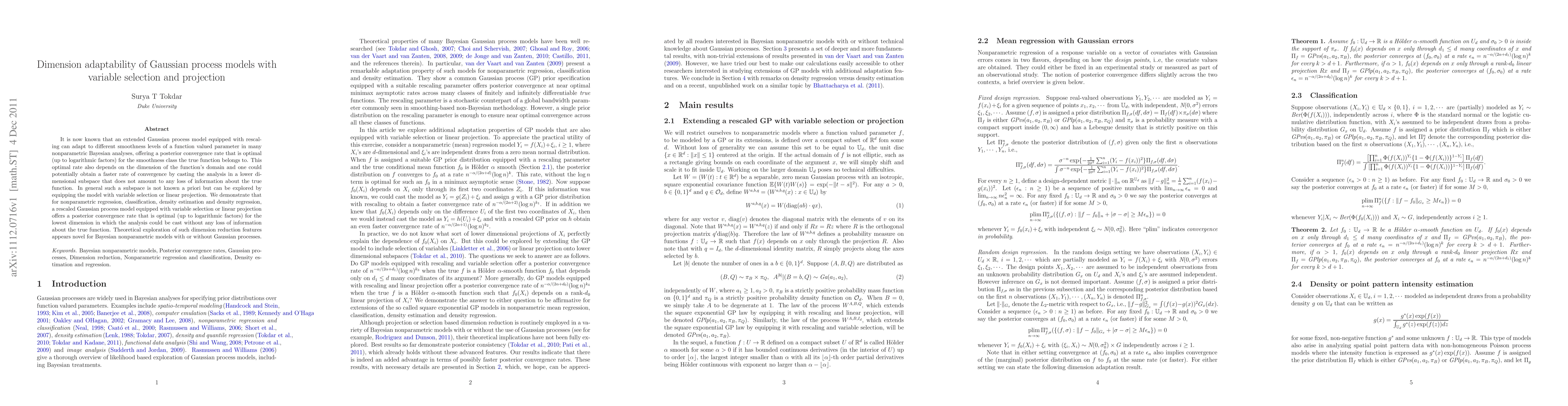 It is now known that an extended Gaussian process model equipped with rescaling can adapt to different smoothness levels of a function valued parameter in many nonparametric Bayesian analyses, offering a posterior convergence rate that is optimal (up to logarithmic factors) for the smoothness class the true function belongs to. This optimal rate also depends on the dimension of the function's domain and one could potentially obtain a faster rate of convergence by casting the analysis in a lower dimensional subspace that does not amount to any loss of information about the true function. In general such a subspace is not known a priori but can be explored by equipping the model with variable selection or linear projection. We demonstrate that for nonparametric regression, classification, density estimation and density regression, a rescaled Gaussian process model equipped with variable selection or linear projection offers a posterior convergence rate that is optimal (up to logarithmic factors) for the lowest dimension in which the analysis could be cast without any loss of information about the true function. Theoretical exploration of such dimension reduction features appears novel for Bayesian nonparametric models with or without Gaussian processes.