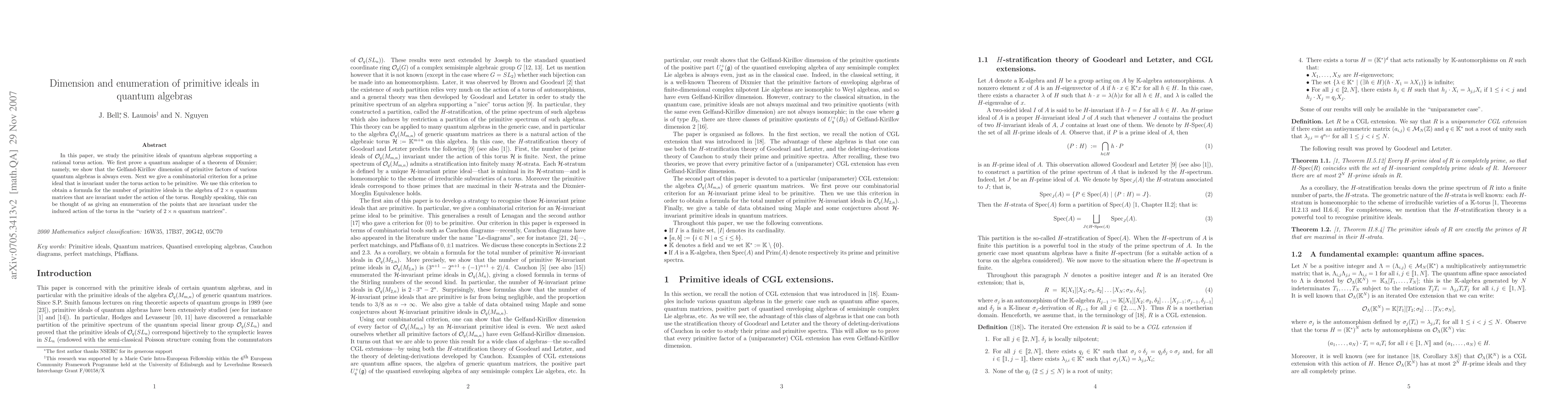In this paper, we study the primitive ideals of quantum algebras supporting a rational torus action. We first prove a quantum analogue of a Theorem of Dixmier; namely, we show that the Gelfand-Kirillov dimension of primitive factors of various quantum algebras is always even. Next we give a combinatorial criterion for a prime ideal that is invariant under the torus action to be primitive. We use this criterion to obtain a formula for the number of primitive ideals in the algebra of $2\times n$ quantum matrices that are invariant under the action of the torus. Roughly speaking, this can be thought of as giving an enumeration of the points that are invariant under the induced action of the torus in the ``variety of $2\times n$ quantum matrices''.