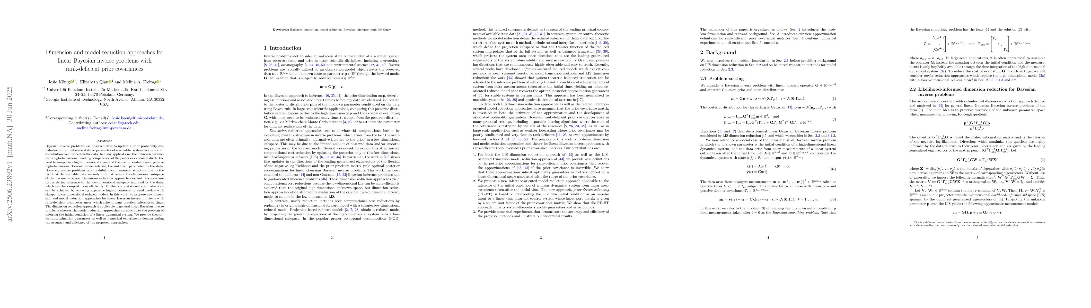 This paper presents new dimension and model reduction methods for linear Bayesian inverse problems, particularly those with rank-deficient prior covariances. These methods aim to efficiently handle high-dimensional, computationally expensive inference tasks by focusing on low-dimensional subspaces informed by the data, and replacing costly high-dimensional models with cheaper lower-dimensional alternatives, supported by theoretical guarantees and numerical evidence.