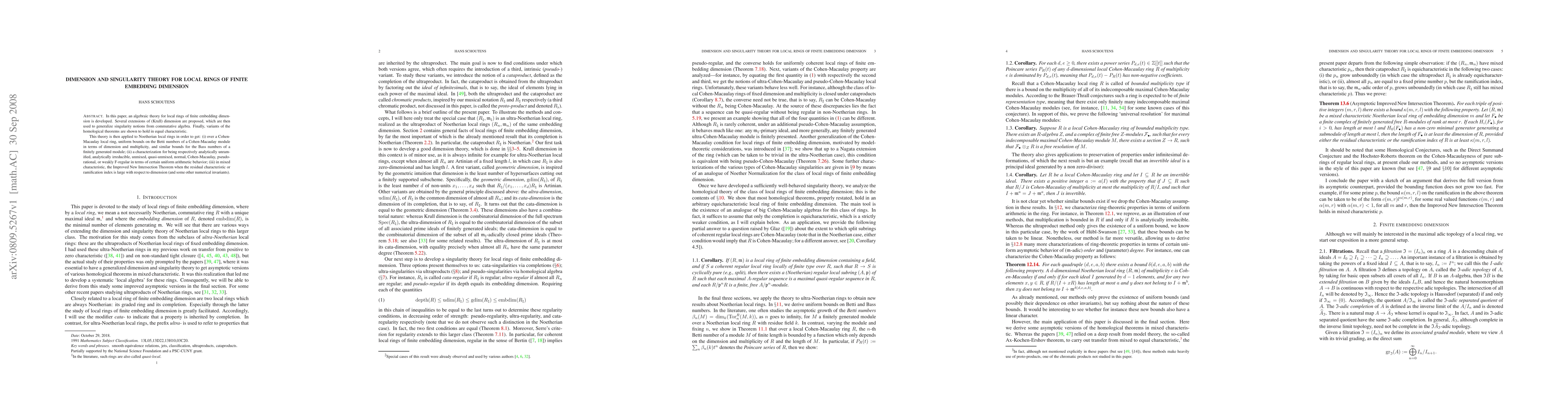 In this paper, an algebraic theory for local rings of finite embedding dimension is developed. Several extensions of (Krull) dimension are proposed, which are then used to generalize singularity notions from commutative algebra. Finally, variants of the homological theorems are shown to hold in equal characteristic. This theory is then applied to Noetherian local rings in order to get: (i) over a Cohen-Macaulay local ring, uniform bounds on the Betti numbers of a Cohen-Macaulay module in terms of dimension and multiplicity, and similar bounds for the Bass numbers of a finitely generated module; (ii) a characterization for being respectively analytically unramified, analytically irreducible, unmixed, quasi-unmixed, normal, Cohen-Macaulay, pseudo-rational, or weakly F-regular in terms of certain uniform arithmetic behavior; (iii) in mixed characteristic, the Improved New Intersection Theorem when the residual characteristic or ramification index is large with respect to dimension (and some other numerical invariants).