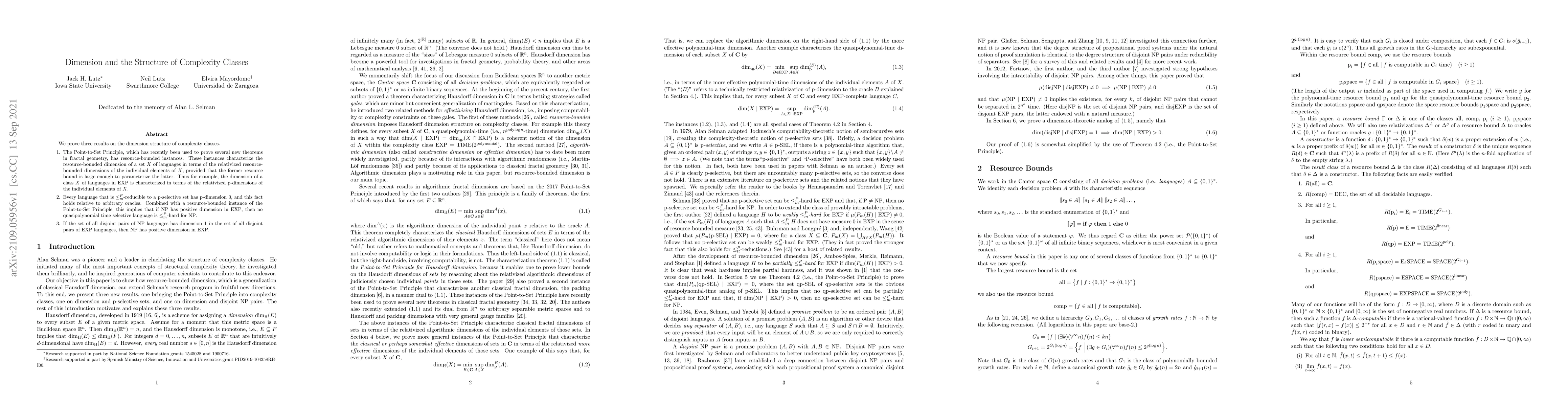 We prove three results on the dimension structure of complexity classes. 1. The Point-to-Set Principle, which has recently been used to prove several new theorems in fractal geometry, has resource-bounded instances. These instances characterize the resource-bounded dimension of a set $X$ of languages in terms of the relativized resource-bounded dimensions of the individual elements of $X$, provided that the former resource bound is large enough to parameterize the latter. Thus for example, the dimension of a class $X$ of languages in EXP is characterized in terms of the relativized p-dimensions of the individual elements of $X$. 2. Every language that is $\leq^P_m$-reducible to a p-selective set has p-dimension 0, and this fact holds relative to arbitrary oracles. Combined with a resource-bounded instance of the Point-to-Set Principle, this implies that if NP has positive dimension in EXP, then no quasipolynomial time selective language is $\leq^P_m$-hard for NP. 3. If the set of all disjoint pairs of NP languages has dimension 1 in the set of all disjoint pairs of EXP languages, then NP has positive dimension in EXP.