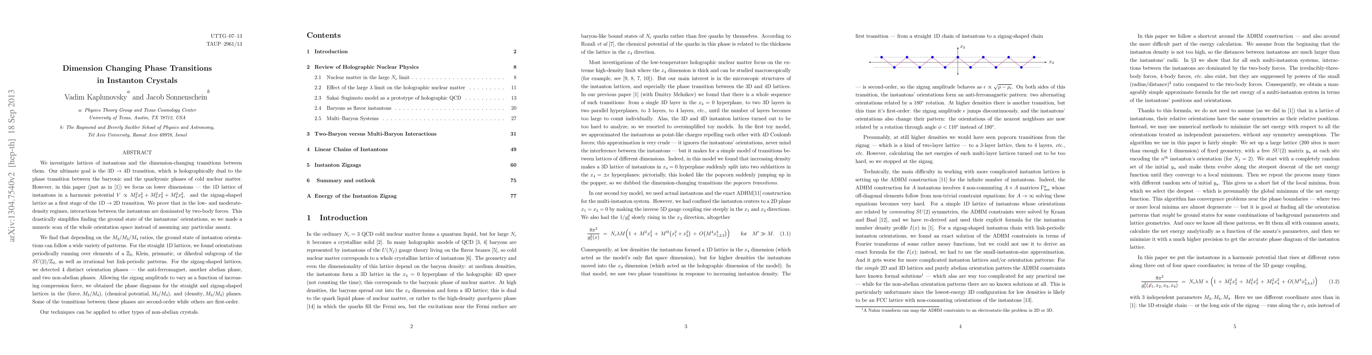 We investigate lattices of instantons and the dimension-changing transitions between them. Our ultimate goal is the 3D->4D transition, which is holographically dual to the phase transition between the baryonic and the quarkyonic phases of cold nuclear matter. However, in this paper (just as in [1]) we focus on lower dimensions -- the 1D lattice of instantons in a harmonic potential V M_2^2x_2^2+M_3^2x_2^2+M_4^2x_4^2 and the zigzag-shaped lattice as a first stage of the 1D->2D transition. We prove that in the low- and moderate-density regimes, interactions between the instantons are dominated by two-body forces. This drastically simplifies finding the ground state of the instantons' orientations, so we made a numeric scan of the whole orientation space instead of assuming any particular ansatz. We find that depending on the M_2/M_3/M_4 ratios, the ground state of instanton orientations can follow a wide variety of patterns. For the straight 1D lattices, we found orientations periodically running over elements of a Z_2, Klein, prismatic, or dihedral subgroup of the SU(2)/Z_2, as well as irrational but link-periodic patterns. For the zigzag-shaped lattices, we detected 4 distinct orientation phases -- the anti-ferromagnet, another abelian phase, and two non-abelian phases. Allowing the zigzag amplitude to vary as a function of increasing compression force, we obtained the phase diagram for the straight and zigzag-shaped lattices in the (force, M_3/M_4), (chemical potential, M_3/M_4), and (density, M_3/M_4) planes. Some of the transitions between these phases are second-order while others are first-order. Our techniques can be applied to other types of non-abelian crystals.