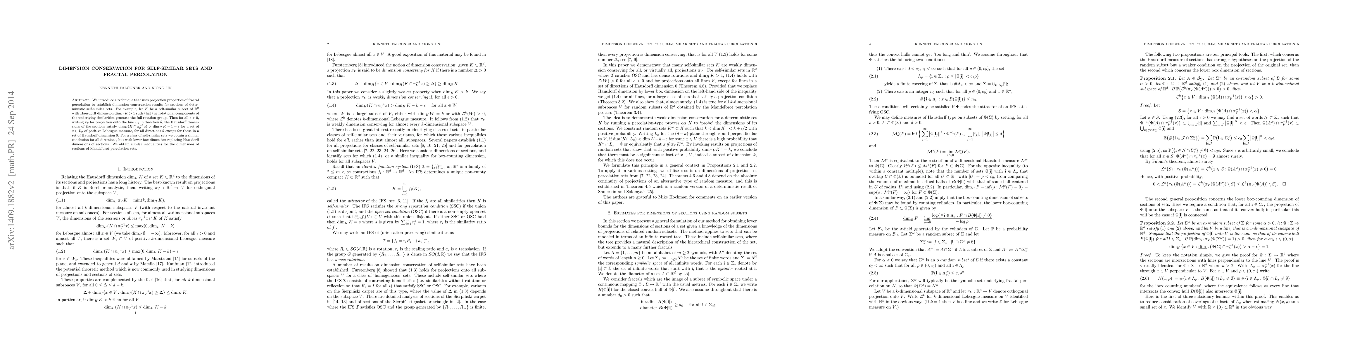 This paper introduces a method leveraging fractal percolation to demonstrate dimension conservation for sections of deterministic self-similar sets. It proves that for certain self-similar sets, the Hausdorff dimension of sections remains nearly constant, except for a negligible set of directions.