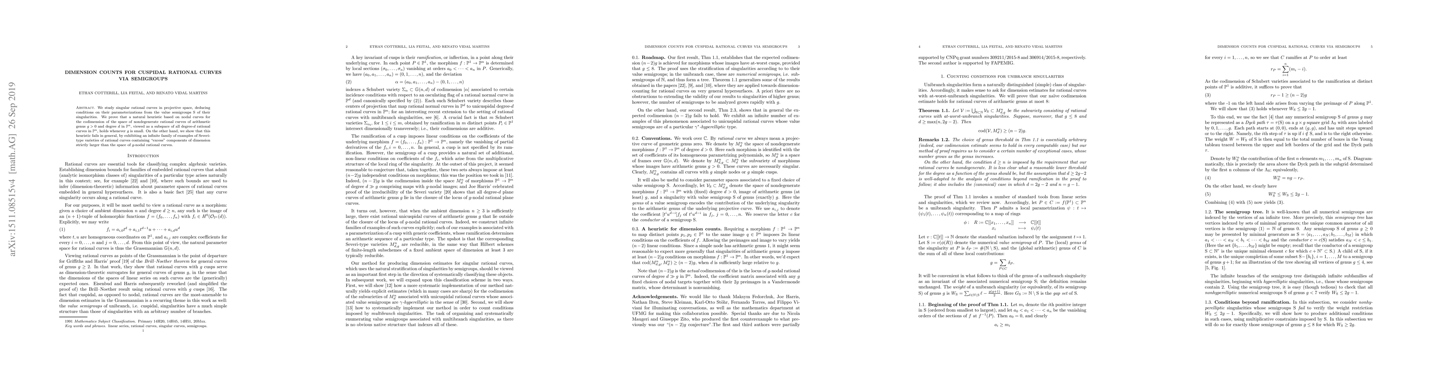 We study singular rational curves in projective space, deducing conditions on their parametrizations from the value semigroups $\sss$ of their singularities. In particular, we prove that a natural heuristic for the codimension of the space of nondegenerate rational curves of arithmetic genus $g>0$ and degree $d$ in $\mb{P}^n$, viewed as a subspace of all degree-$d$ rational curves in $\mb{P}^n$, holds whenever $g$ is small. On the other hand, we show that this heuristic fails in general, by exhibiting an infinite family of examples of Severi-type varieties of rational curves containing "excess" components of dimension strictly larger than the space of $g$-nodal rational curves.