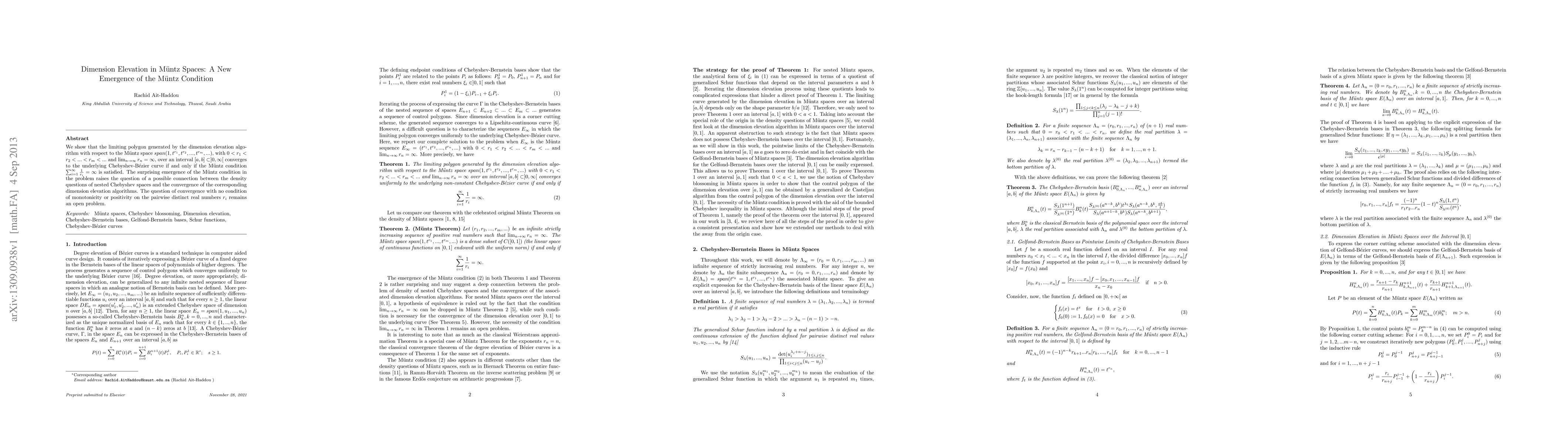 We show that the limiting polygon generated by the dimension elevation algorithm with respect to the \muntz space $span(1,t^{r_1},t^{r_2},...,t^{r_m},...)$, with $0 < r_1 < r_2 < ... < r_m < ...$ and $\lim_{n\to\infty}r_n = \infty$, over an interval $[a,b]\subset]0,\infty[$ converges to the underlying Chebyshev-B\'ezier curve if and only if the \muntz condition $\sum_{i=1}^{\infty} \frac{1}{r_i} = \infty$ is satisfied. The surprising emergence of the \muntz condition in the problem raises the question of a possible connection between the density questions of nested Chebyshev spaces and the convergence of the corresponding dimension elevation algorithms. The question of convergence with no condition of monotonicity or positivity on the pairwise distinct real numbers $r_i$ remains an open problem.