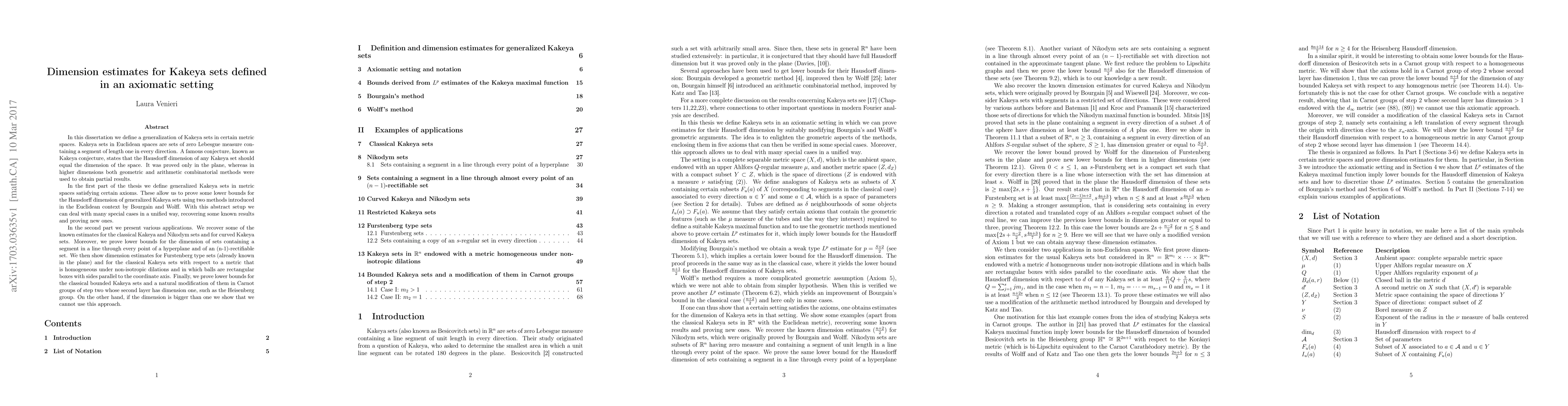 The introduction of an axiomatic framework for generalized Kakeya sets in metric spaces, enabling a unified treatment of various special cases and the application of existing methods to prove dimension estimates.