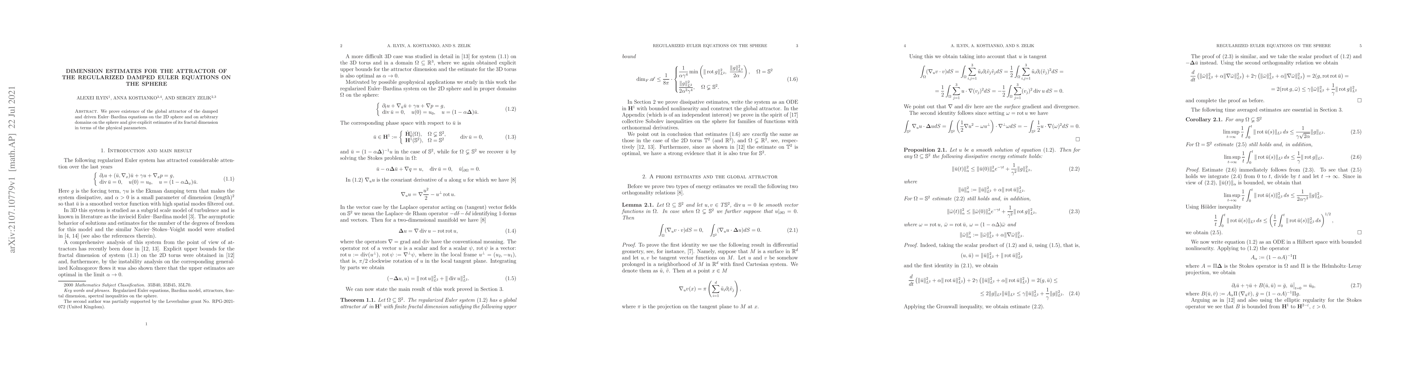 Researchers prove the existence of a global attractor for the damped Euler-Bardina equations on the sphere and estimate its fractal dimension based on physical parameters.