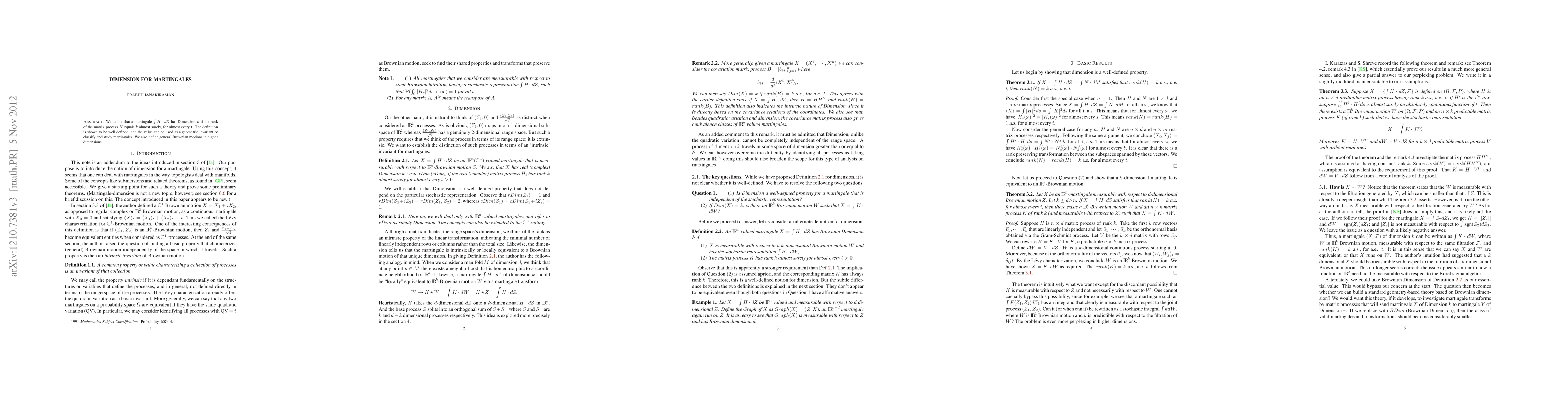 A martingale \int H.dZ is defined as having Dimension k if H has rank k almost surely, almost all t. Dimension can be used as a geometric invariant to classify and study martingales. We also define general Brownian motions in higher dimensions.